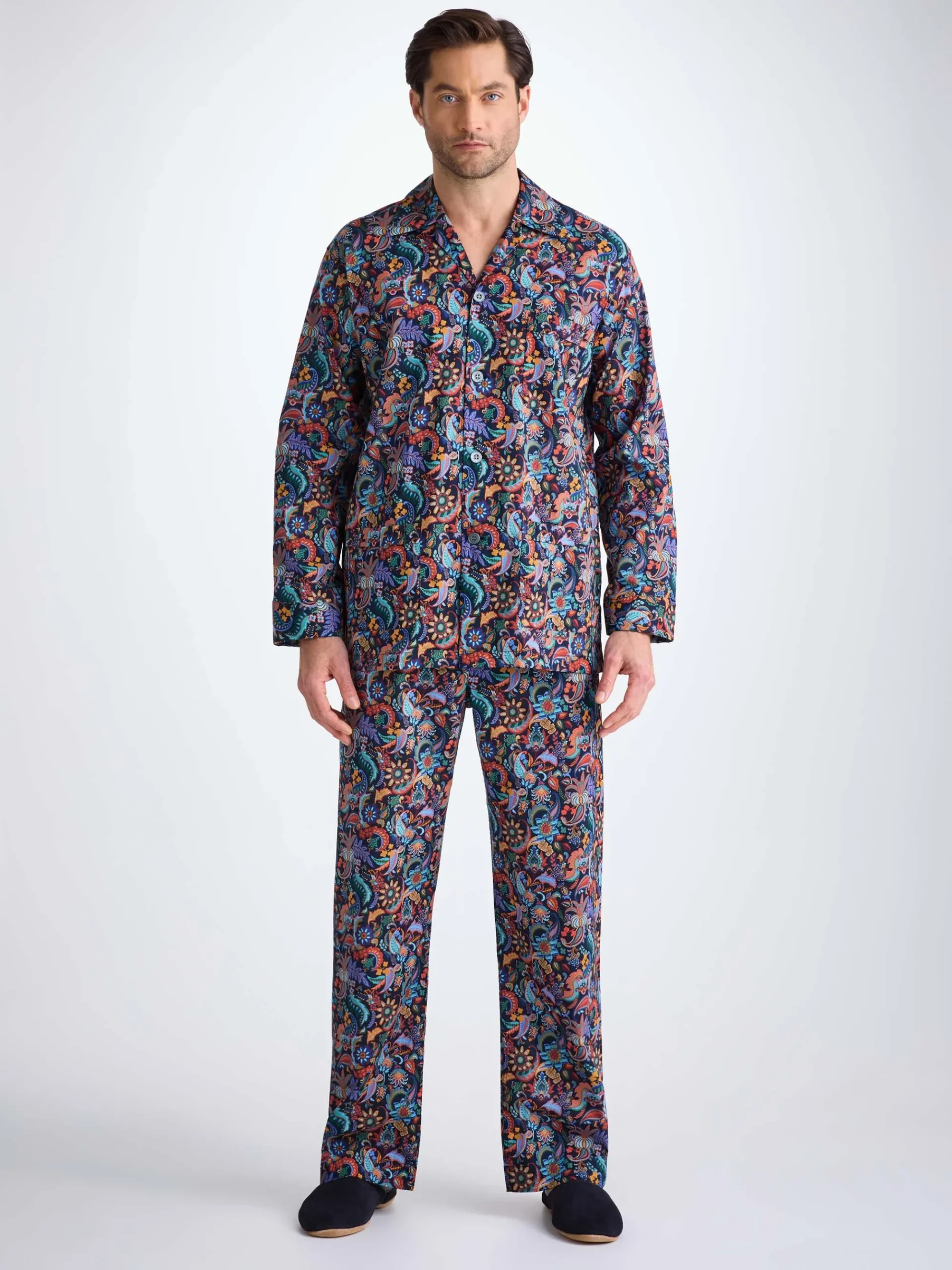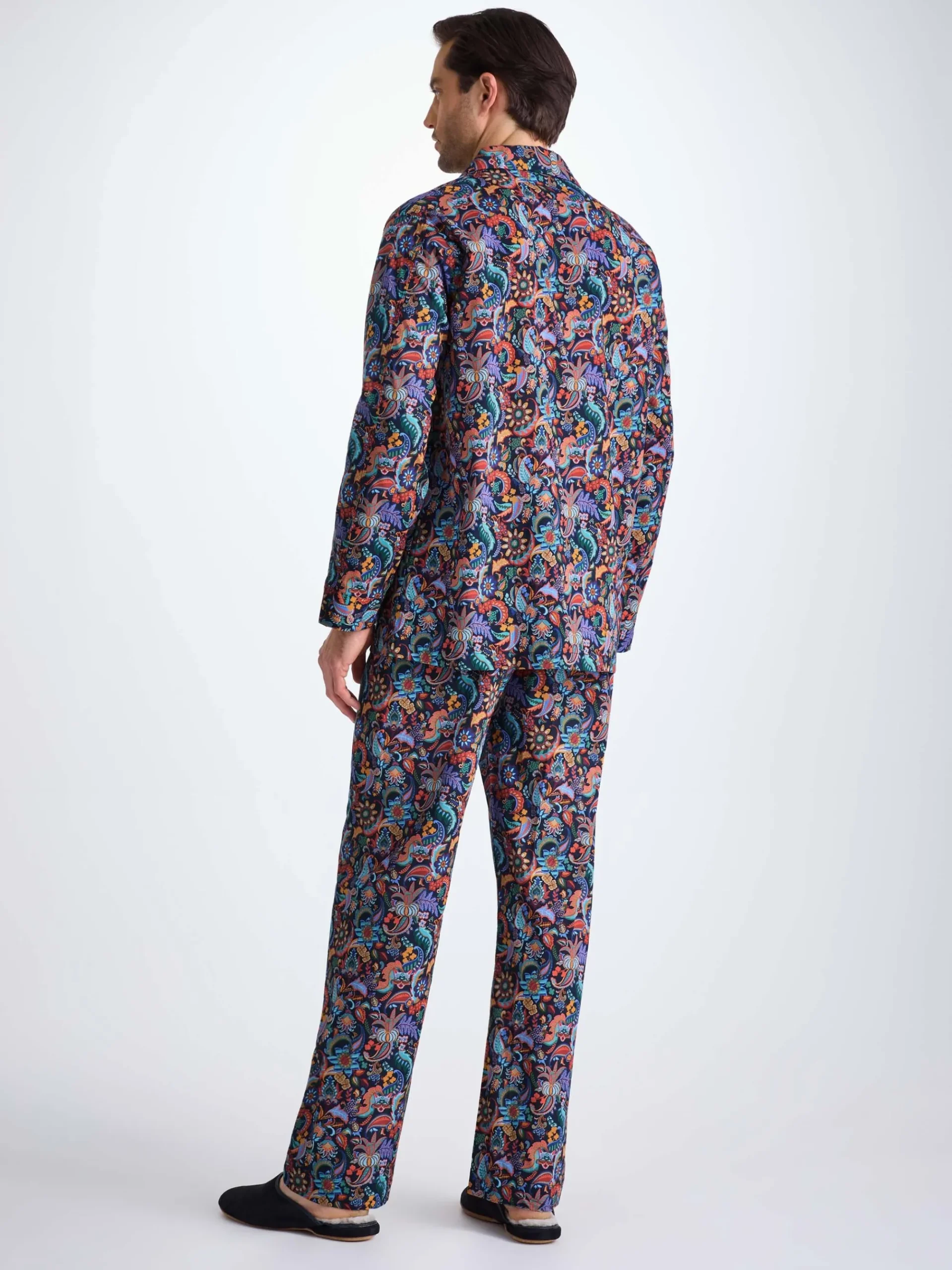 Our jungle paisley print combines classic ornamental paisleys with stylised jungle flowers, plant and hidden Derek Rose references. Find the Derek Rose cat, a Rose Star and even our signature stripes. Made with a single breast pocket, classic flat collar, button-through top, and adjustable two-button elasticated waist, they’ll guarantee you drift off peacefully.