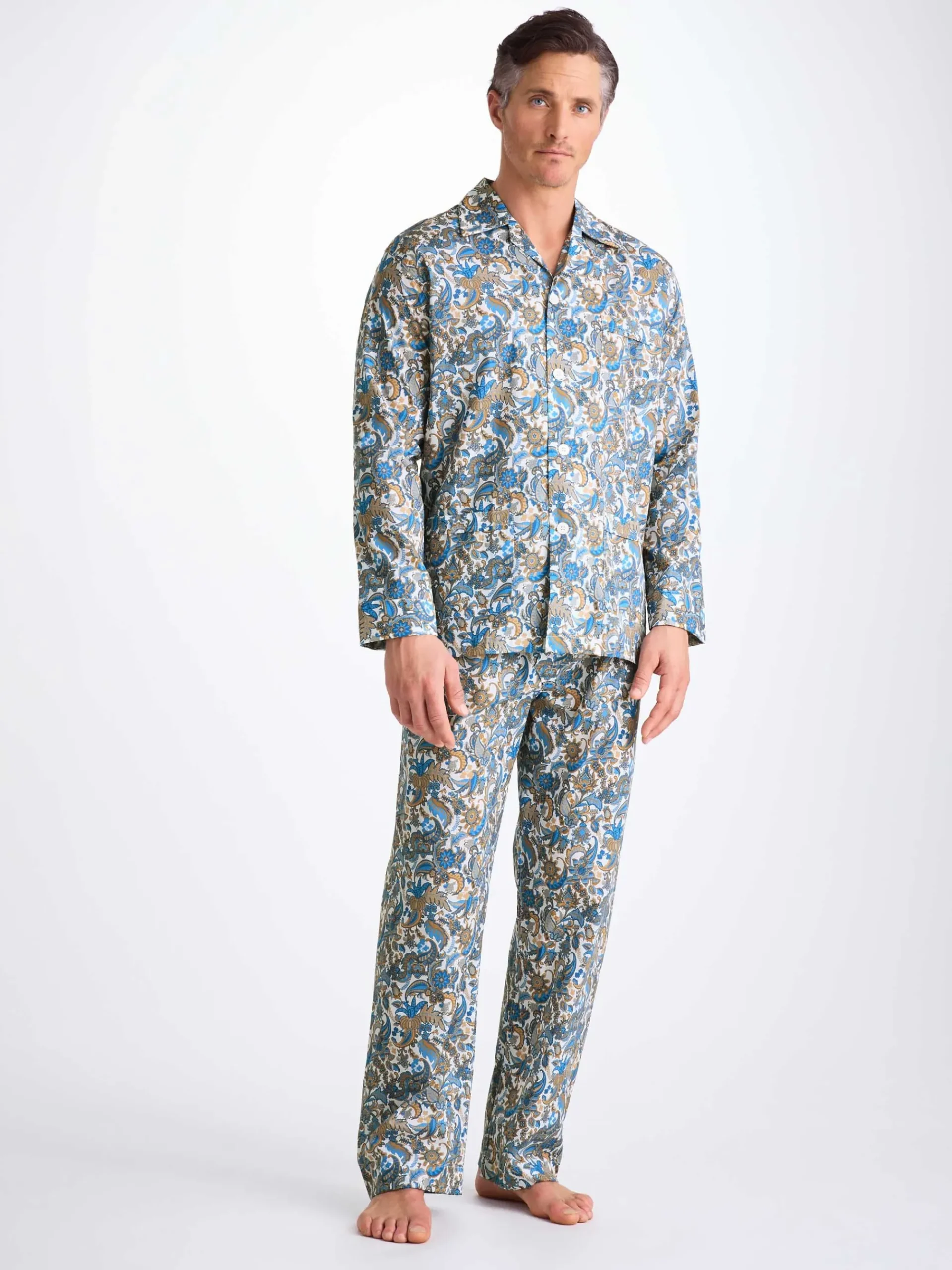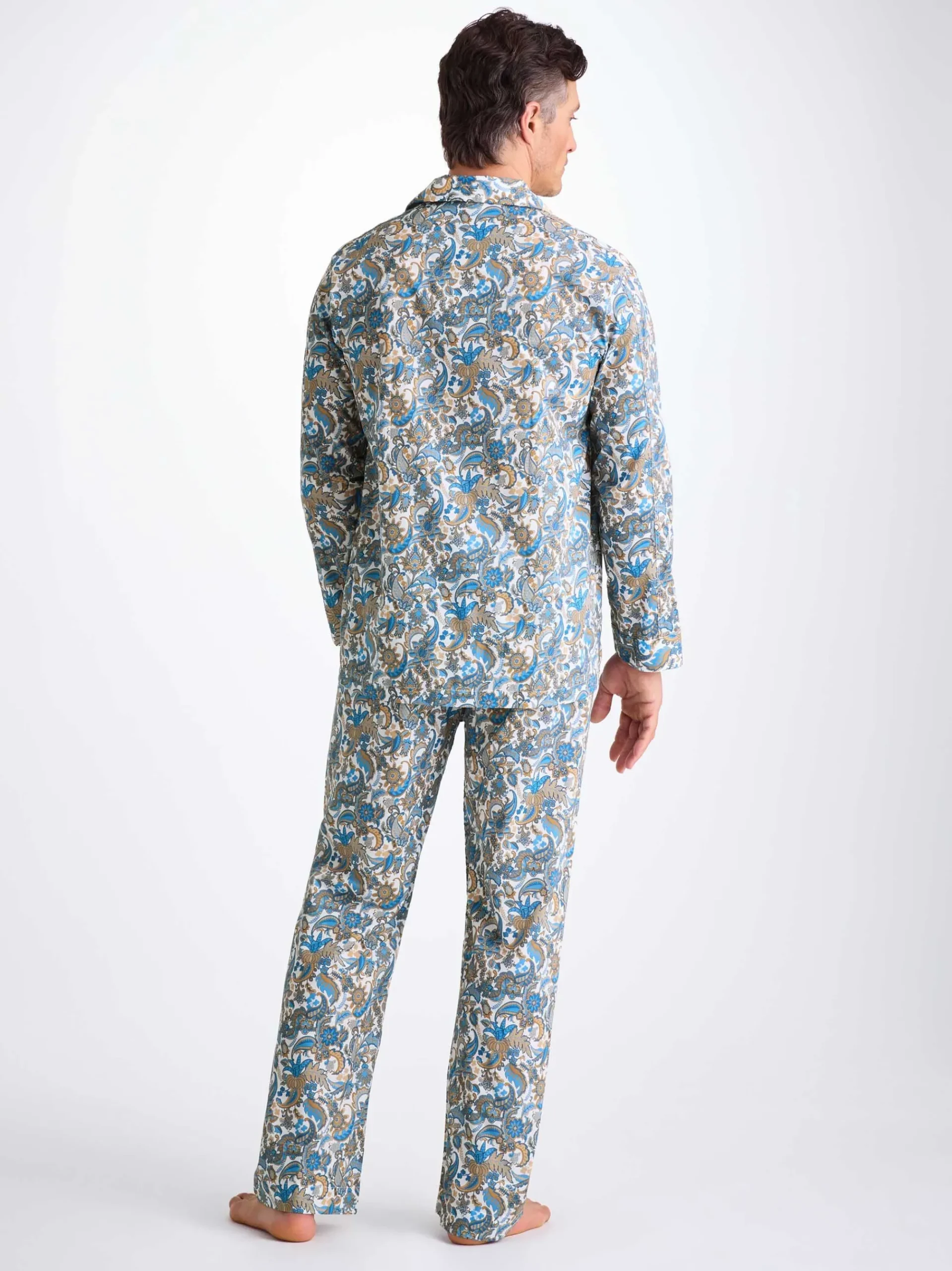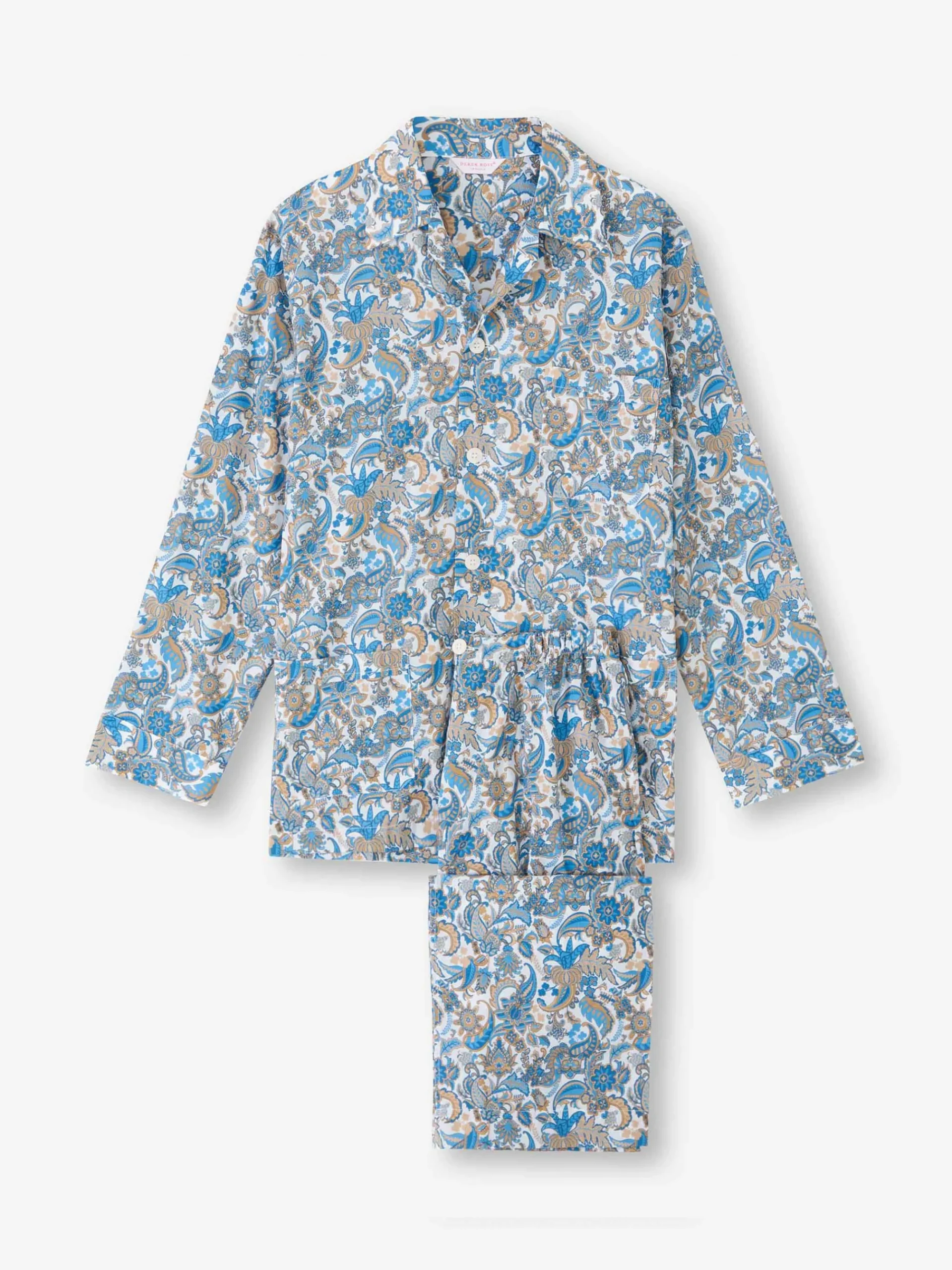 Our jungle paisley print combines classic ornamental paisleys with stylised jungle flowers, plant and hidden Derek Rose references. Find the Derek Rose cat, a Rose Star and even our signature stripes. Made with a single breast pocket, classic flat collar, button-through top, and adjustable two-button elasticated waist, they’ll guarantee you drift off peacefully.
