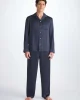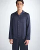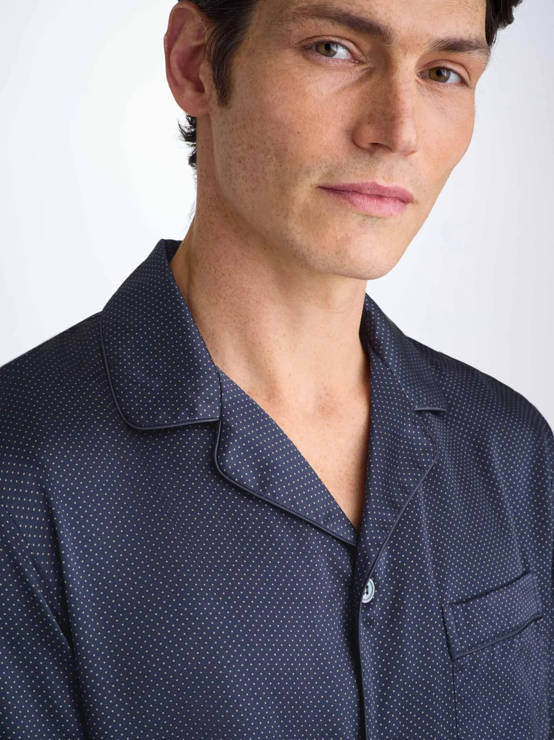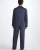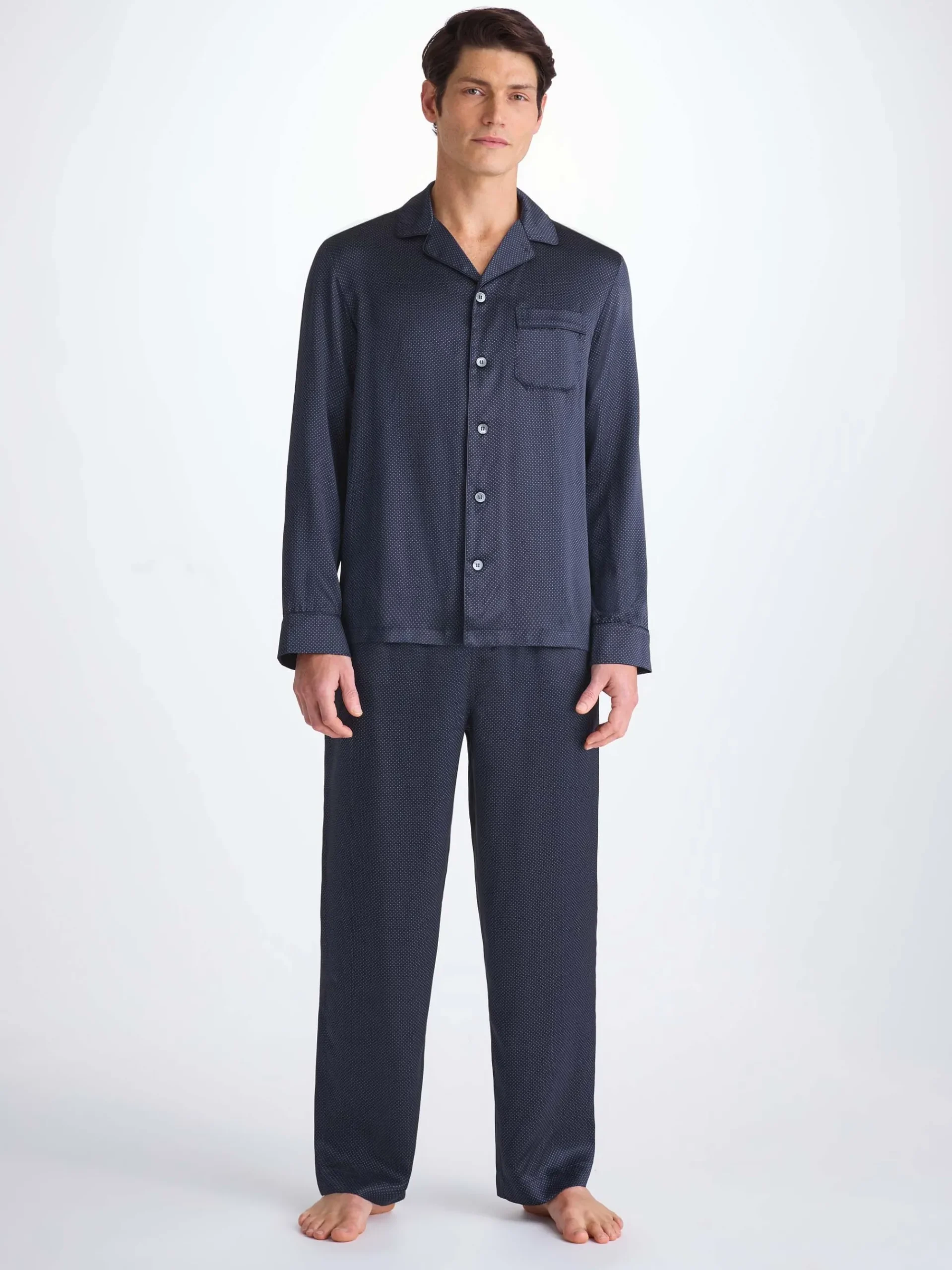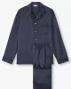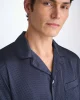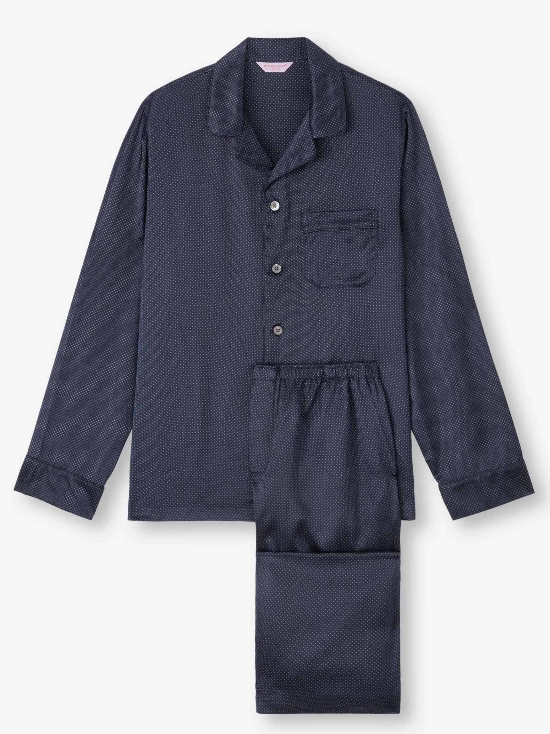 The micro dot silk pyjama has been redesigned for a contemporary cut; one that is closer to the body without being tight. The jacket now comes with a revere collar and also has button through fastenings with a piped breast pocket. Furthermore, the rest of the jacket is piped throughout with complementary dark navy silk piping.