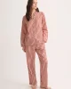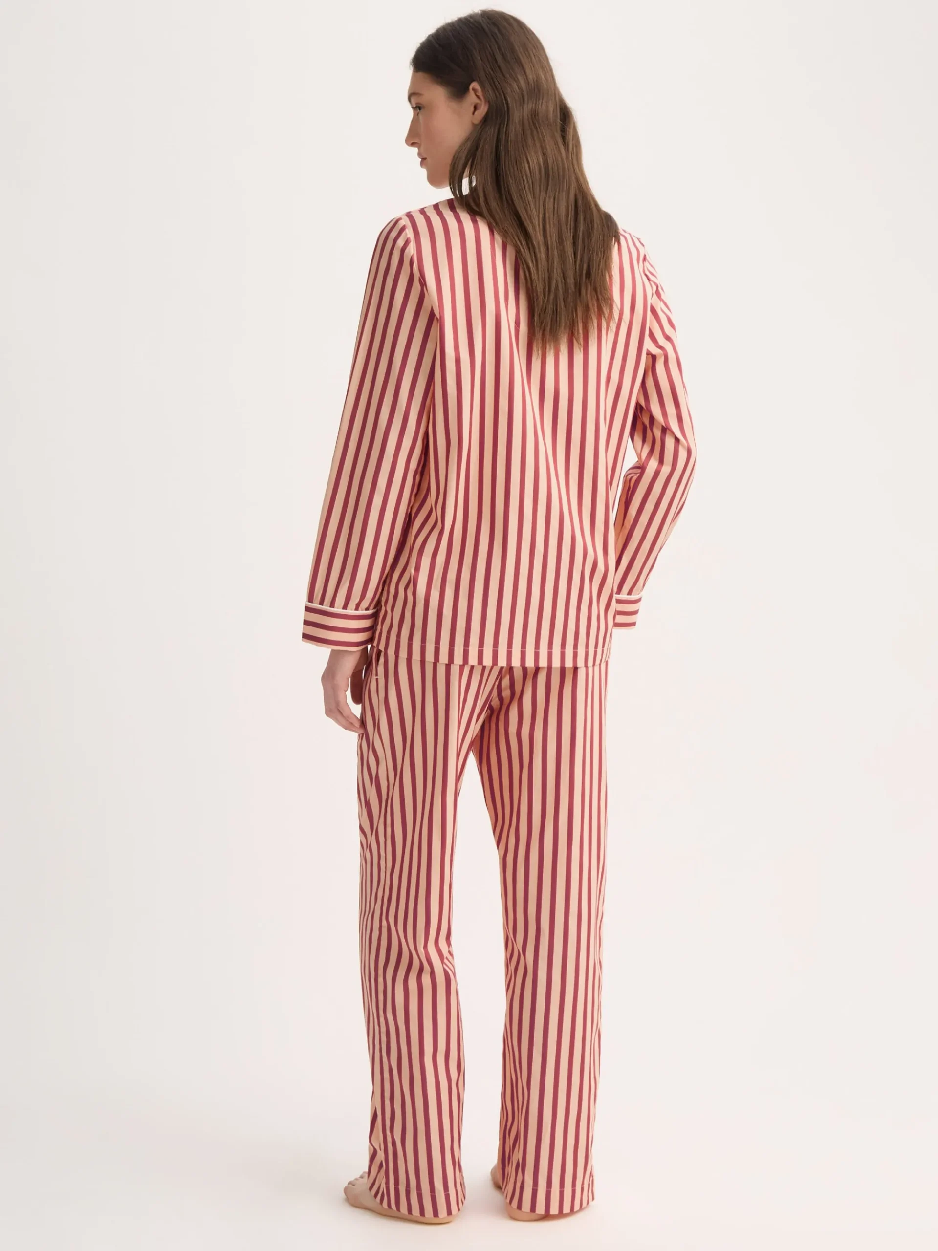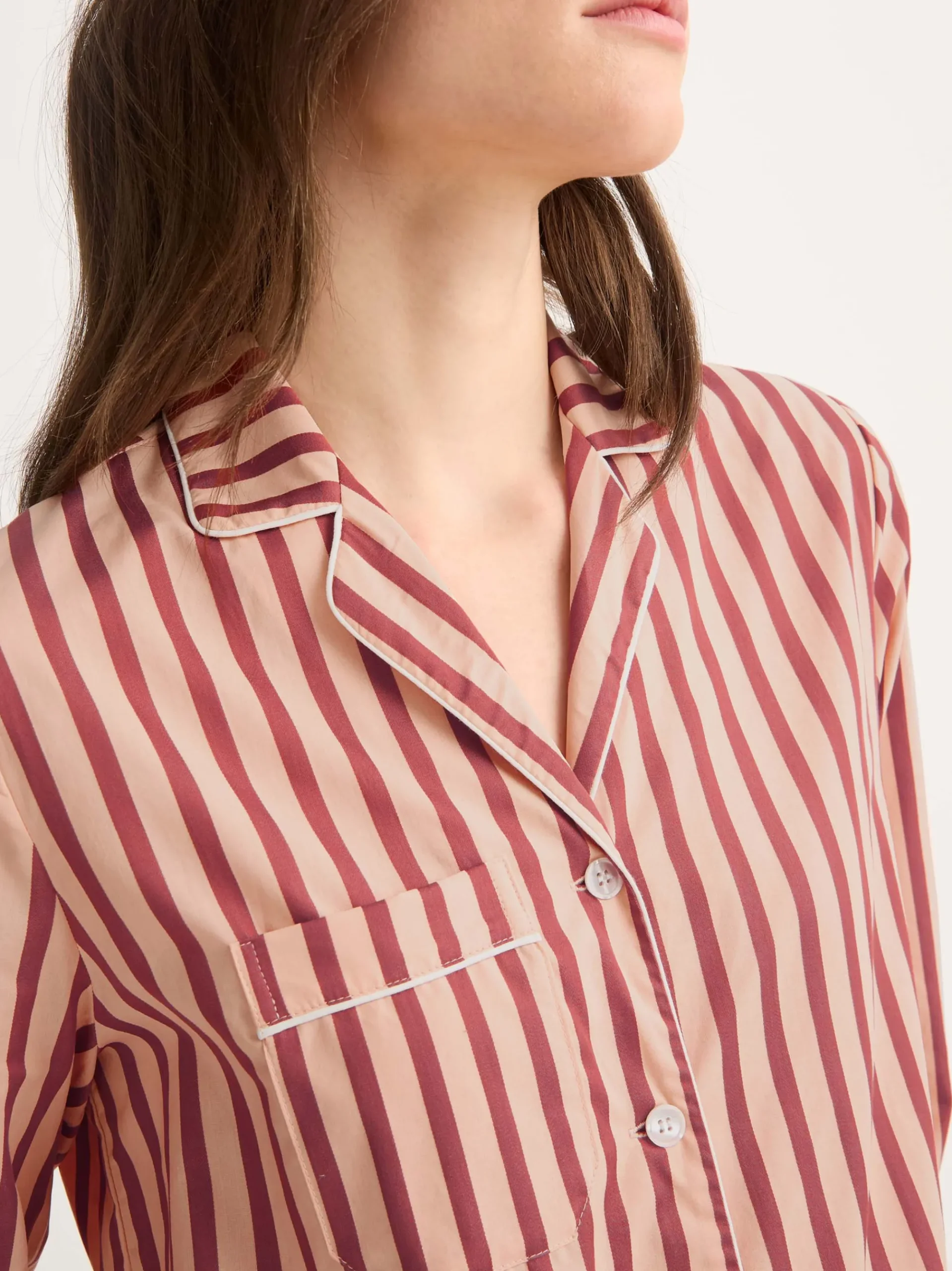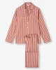 Designed for sleep, lounging, and laid-back mornings, our Capri pyjamas feature a part-satin woven stripe in peach and red — a vibrant yet elegant combination that brings a fresh feel to classic nightwear.