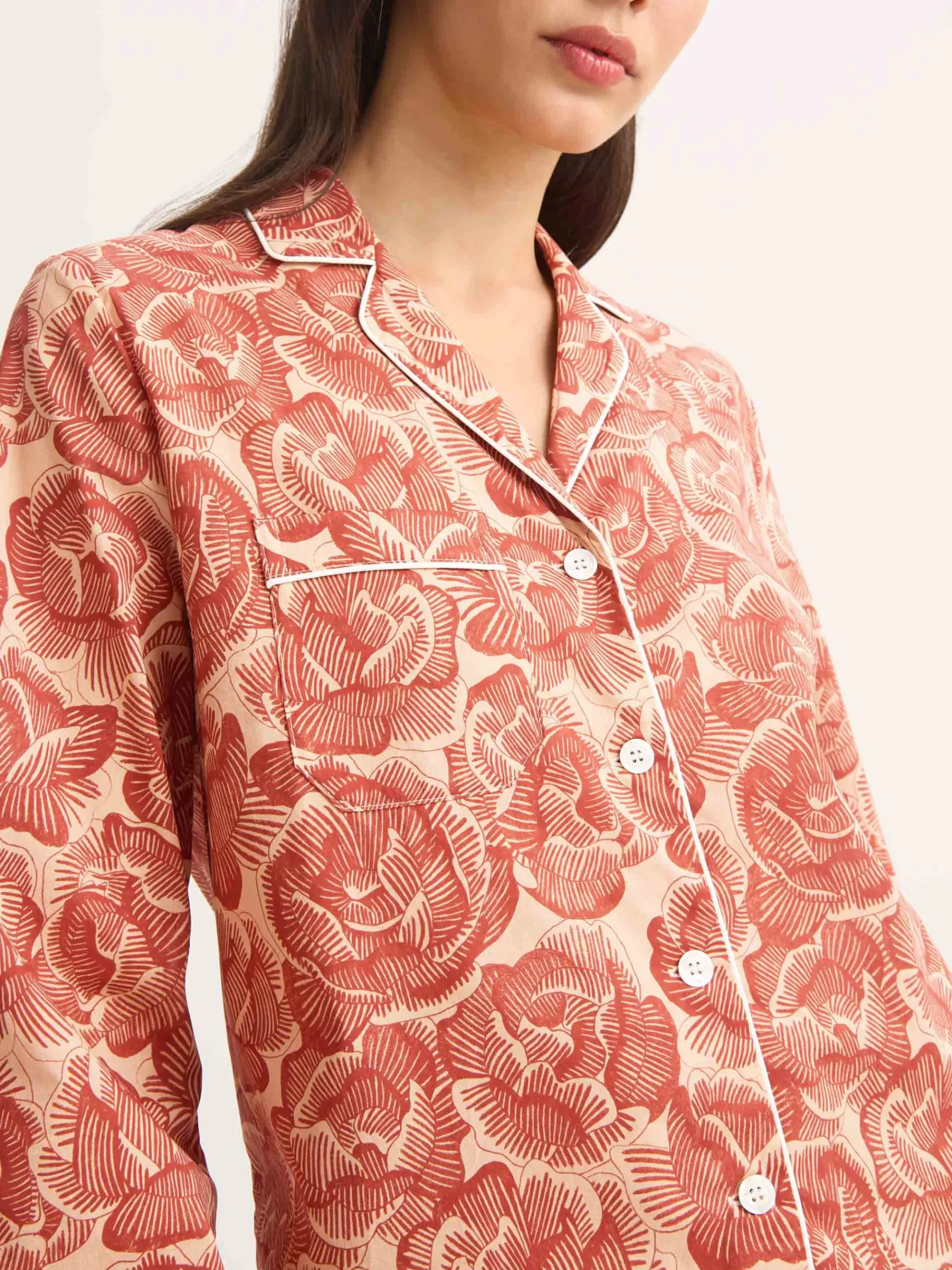 Inspired by the roseāan enduring symbol of Derek Roseāthis women’s rustic red pyjama set features a hand-drawn floral print, digitally rendered to preserve its original texture and detail. The two-tone colourway creates a refined play of pattern and negative space.