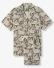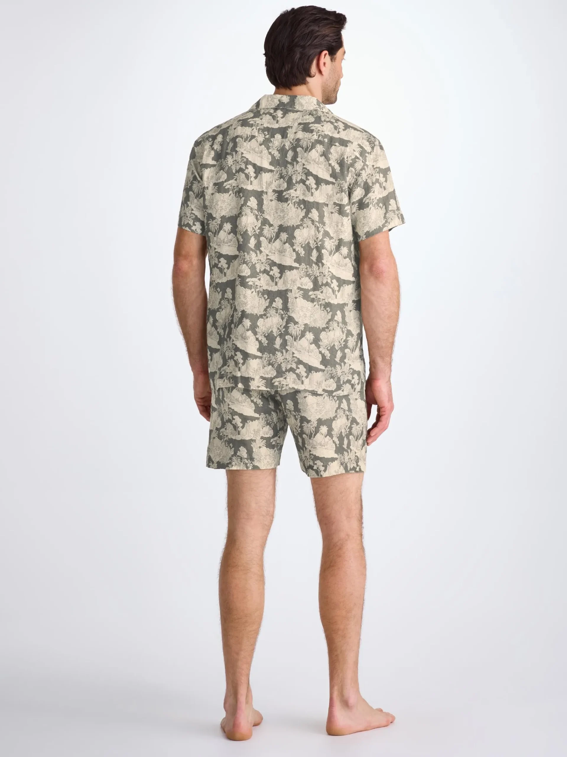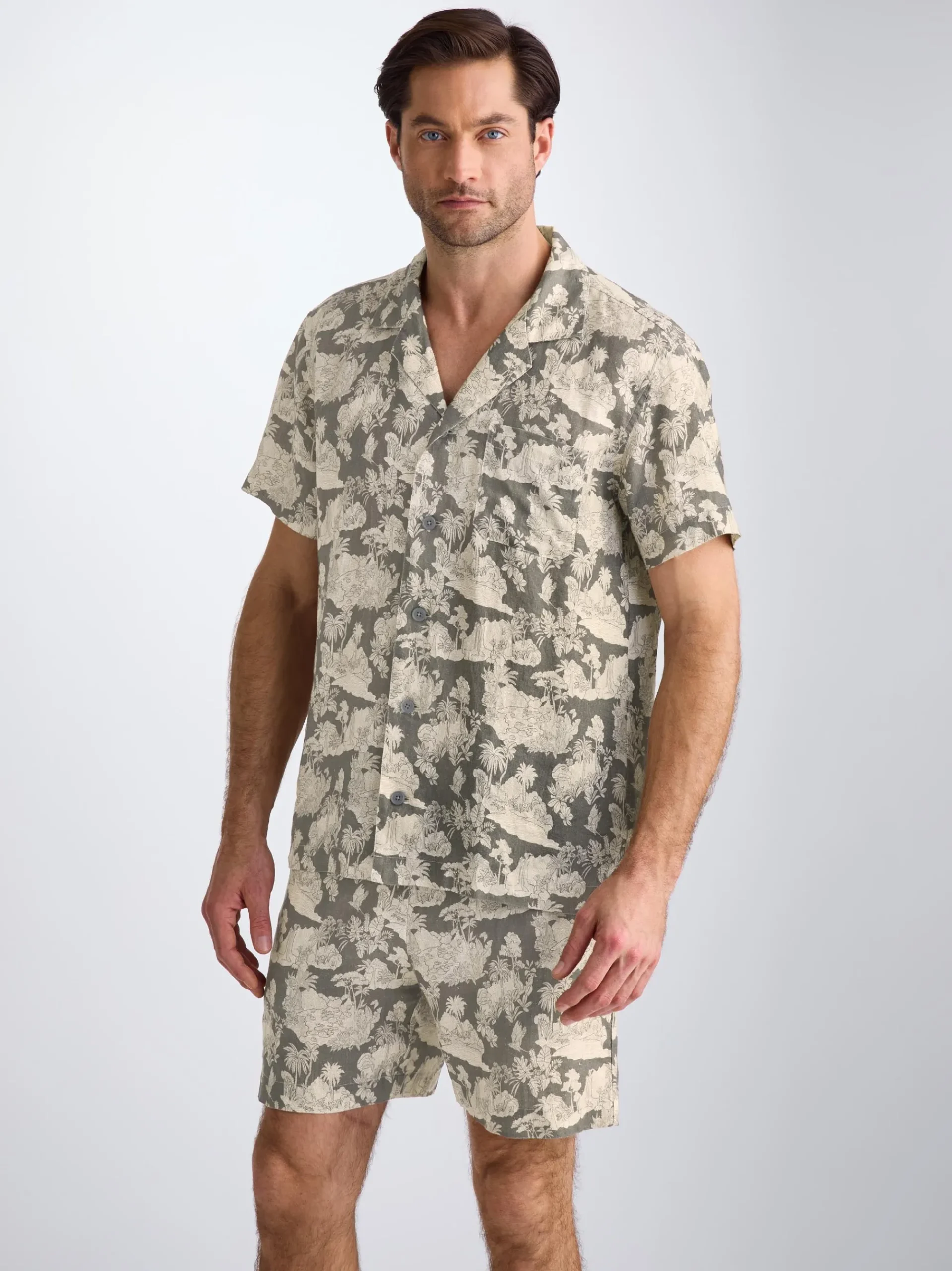 Designed with a comfortable relaxed fit and short sleeves, discover our island hopping print in khaki. A hand drawn modern interpretation of a toile de Jouy, find tropical trees and plant life.