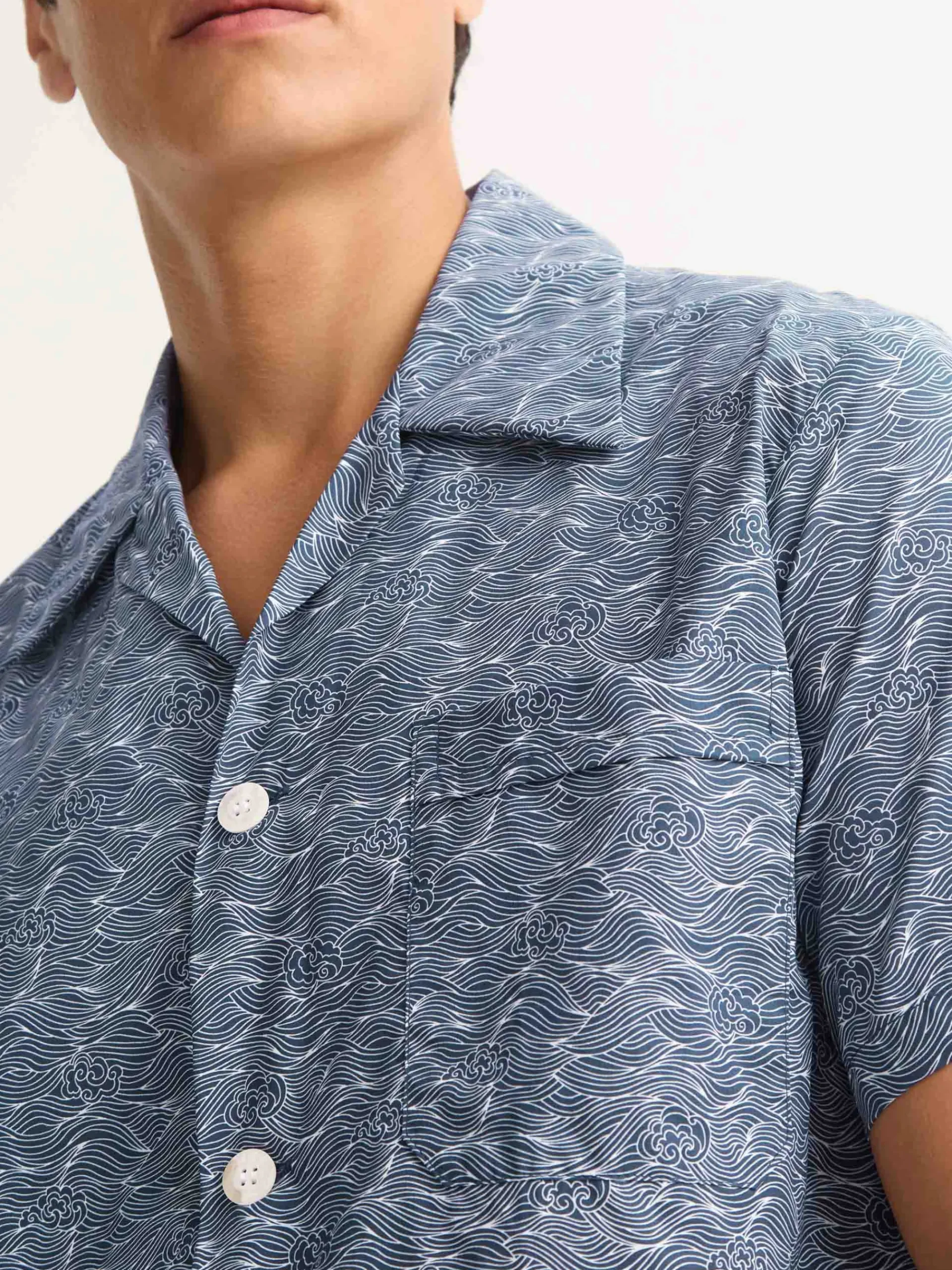 Inspired by the calm of the evening sky, this flowing Night Sky print features stylised clouds drifting across a deep navy background, creating a refined and timeless sleepwear design.