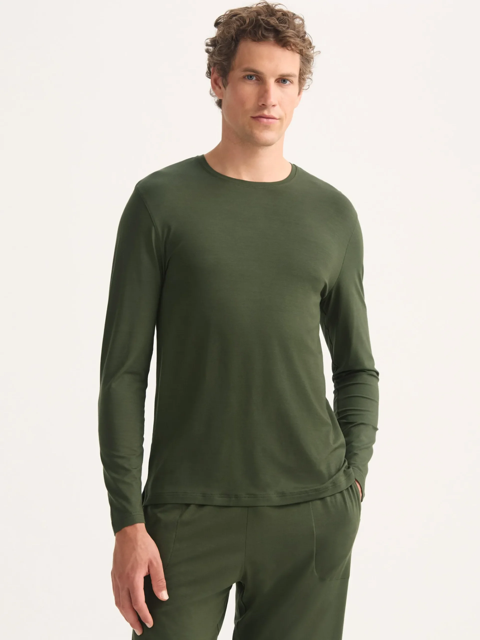 The men’s Basel long sleeve t-shirt in evergreen is the result of countless trials to create the perfect downtime essential. With its flattering yet comfortable fit, it’s ideal for sleeping, lounging or long-haul travel—an all-round staple you’ll wear on repeat.