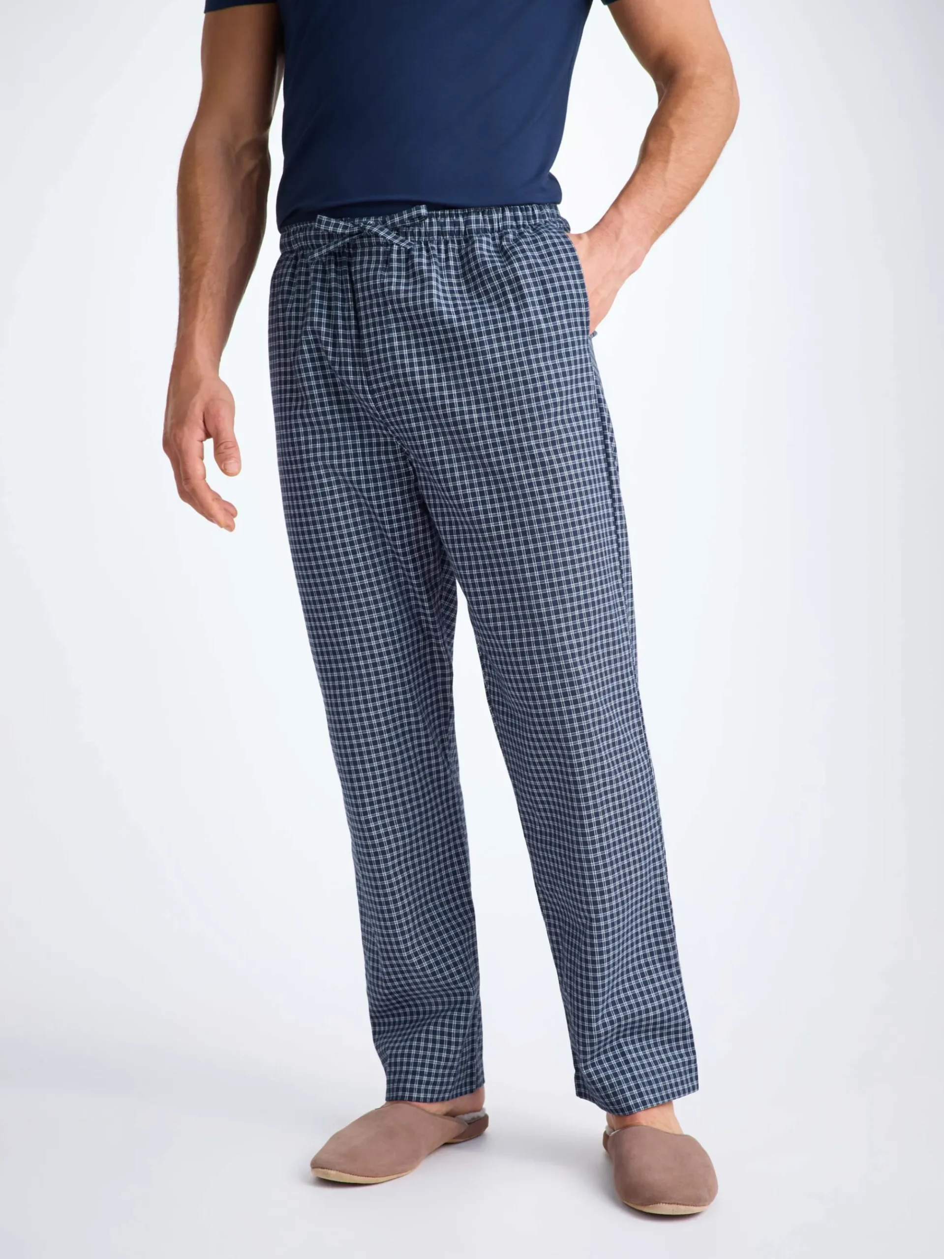Our lounge trousers feature a combined elastic and self-fabric tied waist for a comfortable fit and two inset side pockets and a rear patch pocket to help keep your phone and other items close while you’re lounging.