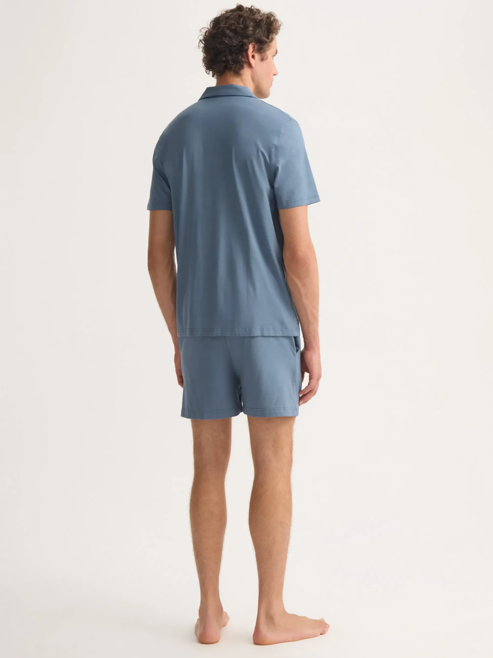 Our men’s Basel short pyjamas in a timeless storm blue are crafted from our signature micro modal stretch, offering unparalleled softness and a naturally breathable feel against the skin. With temperature-regulating fibres that adapt to your body, they keep you cool in the heat and warm when it’s cooler—making them perfect for year-round wear.