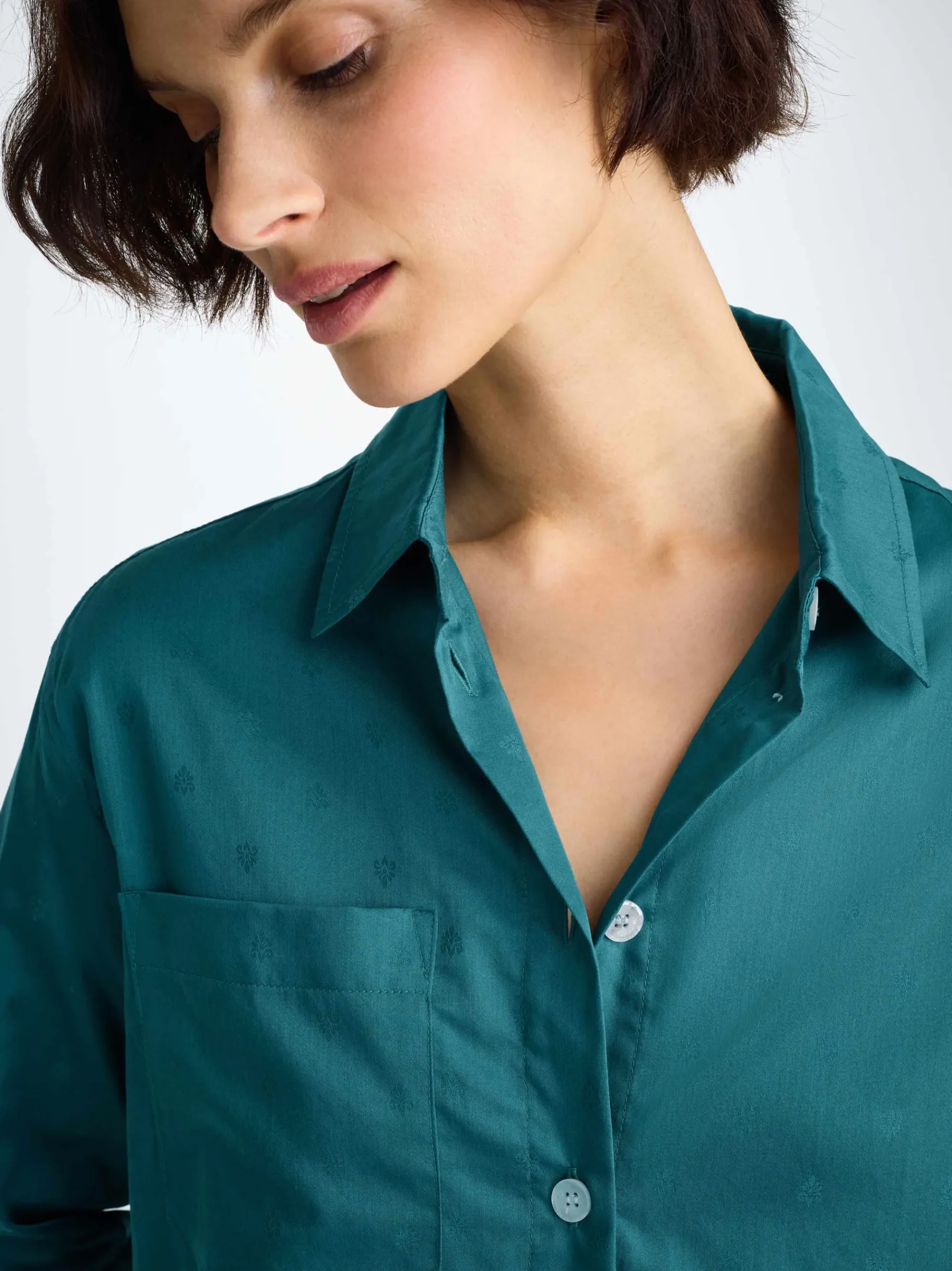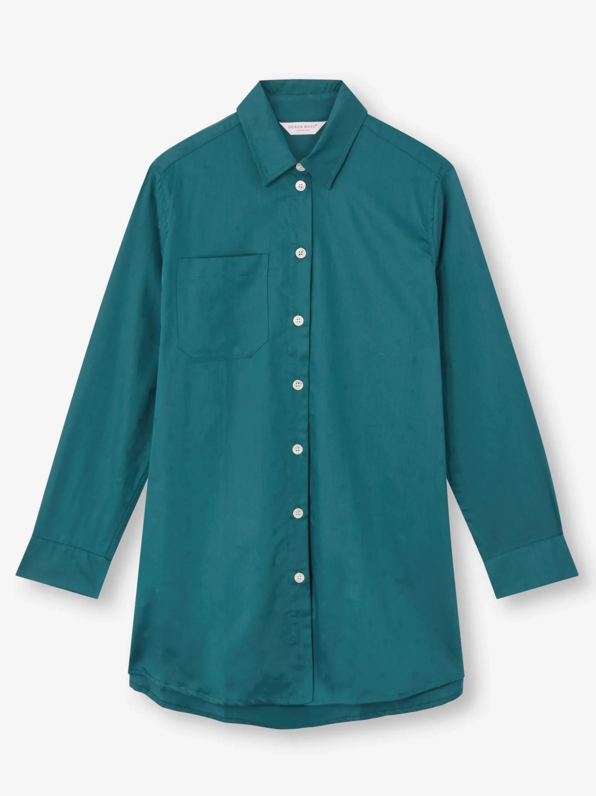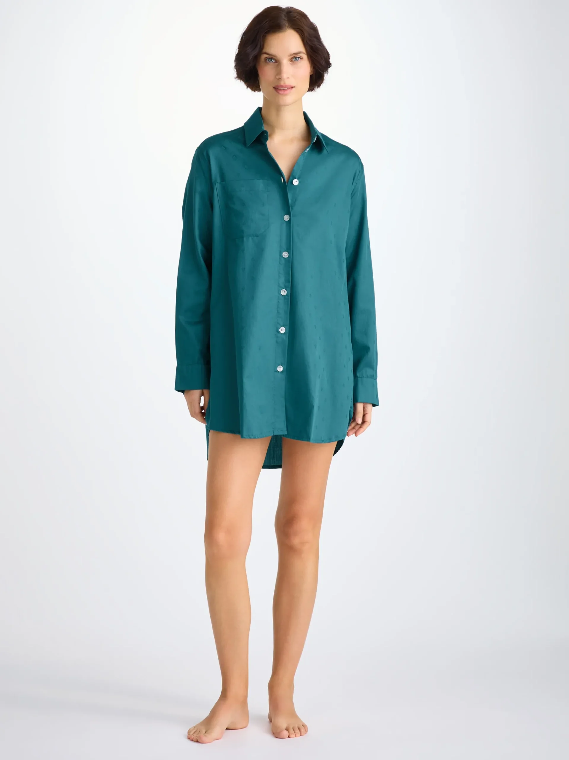Seen here in jungle green with a jacquard paisley motif. This nightshirt has been constructed with a box pleat for ease of movement and simple curved hem with side vents for a perfect nights sleep.