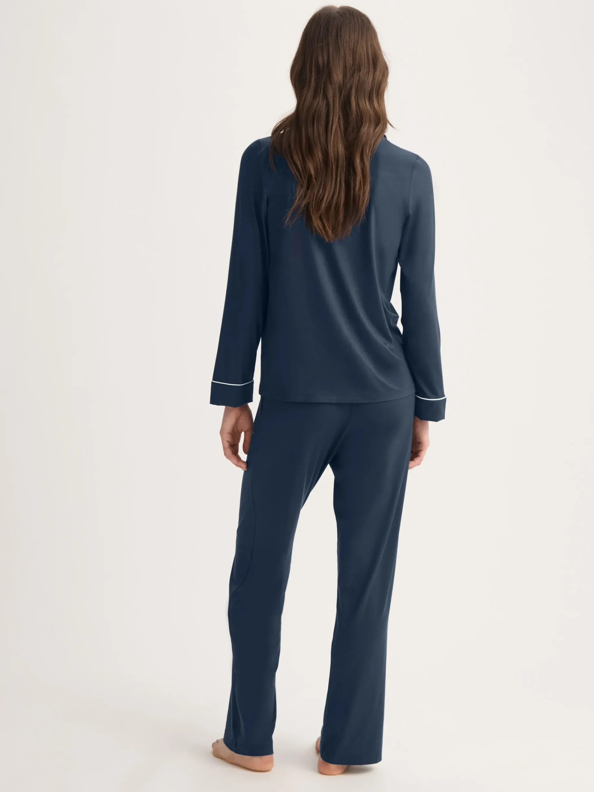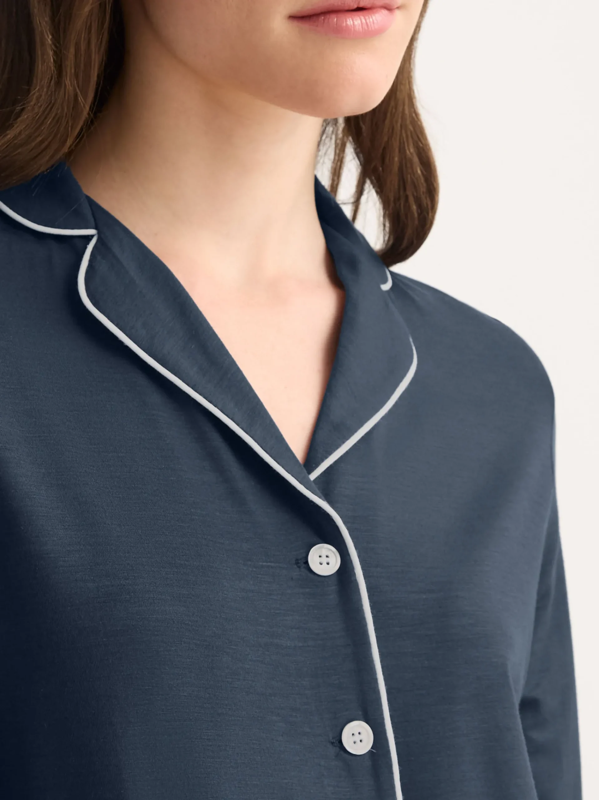 Combining a comfortable and flattering shape with intricate details, our navy Lara women’s pyjamas will keep you looking great and feeling comfortable throughout the seasons.