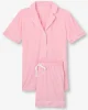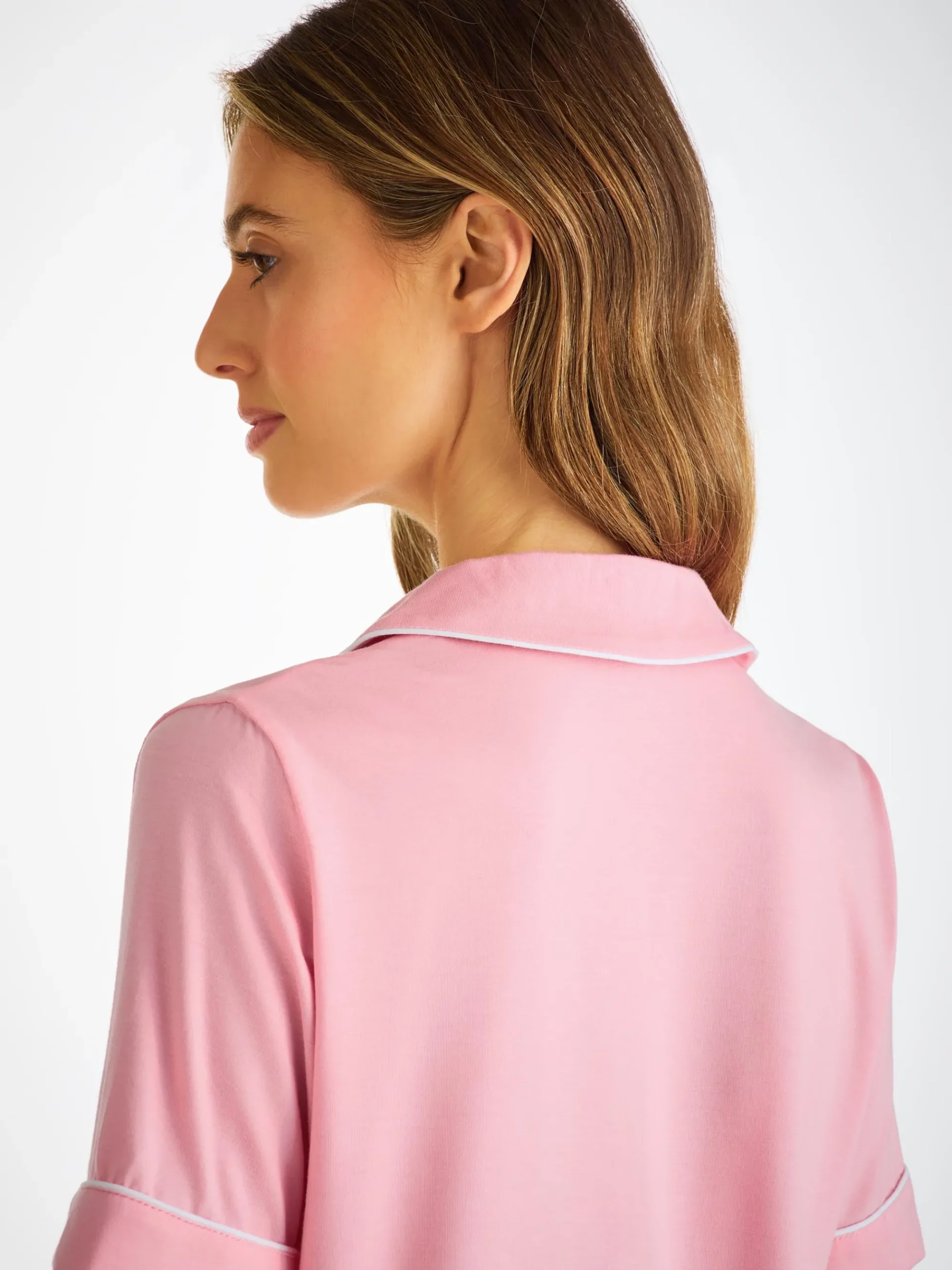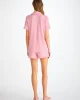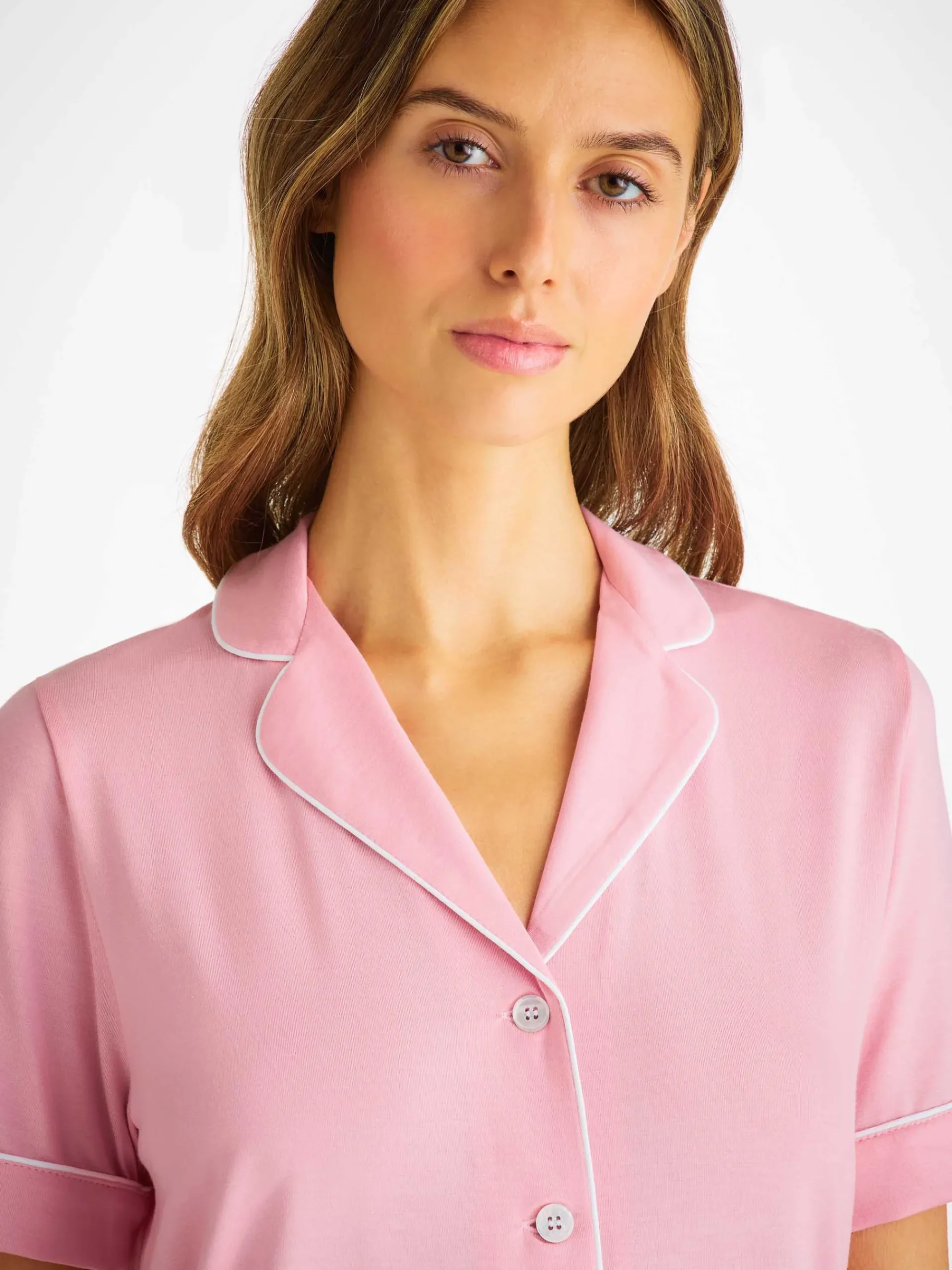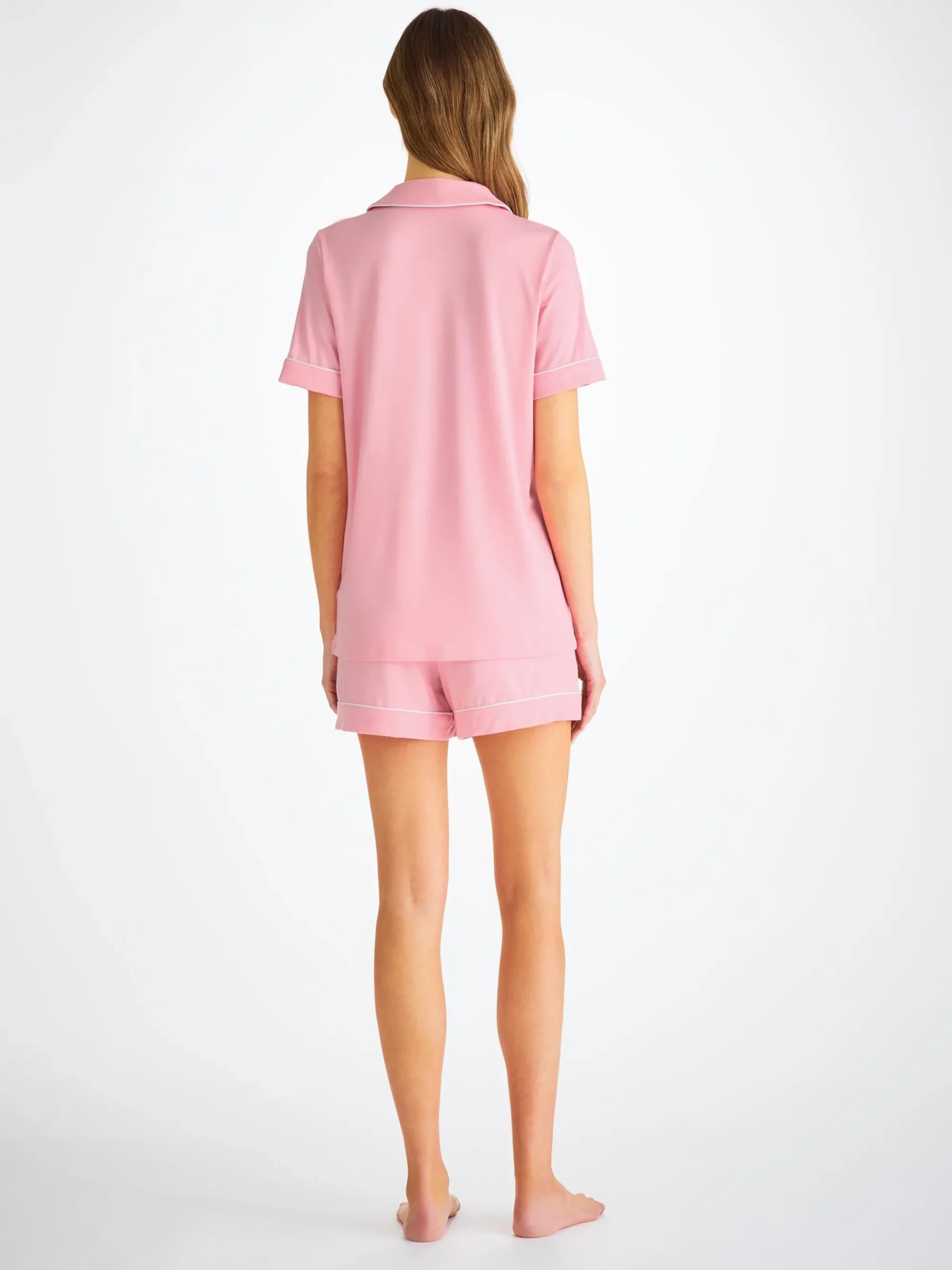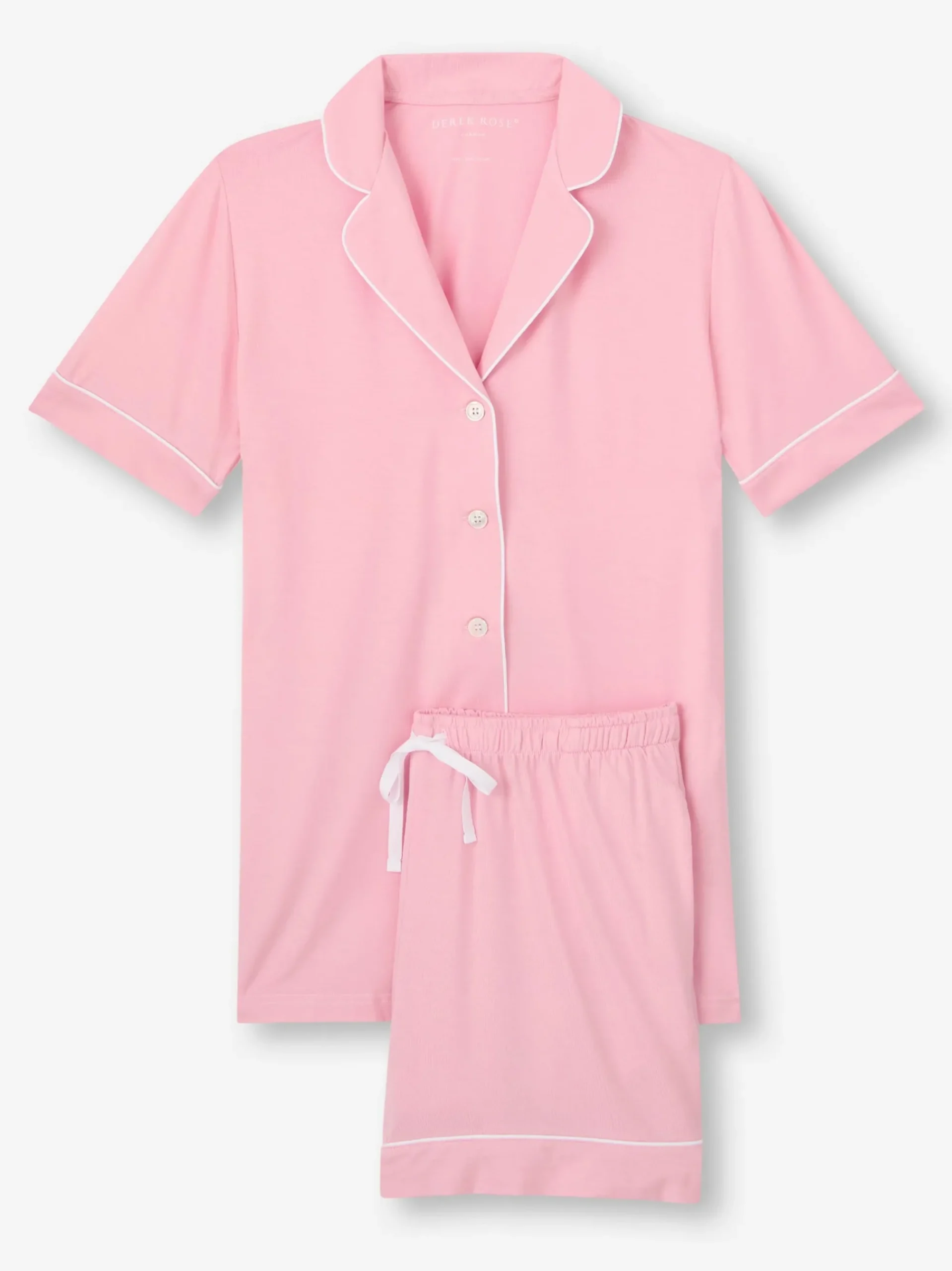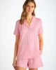 Designed for a flattering but comfortable shape, our women’s shortie pyjamas in ballet pink will keep you looking great and feeling comfortable throughout the seasons. The short-sleeve jacket top features a fully piped finish in contrasting white piping for a stylish appearance and the shorts have piped cuffs with an elasticated and drawstring waist for practicality. The Lara also has a higher waist for a more natural fit and improved comfort, and the most important addition? Pockets!