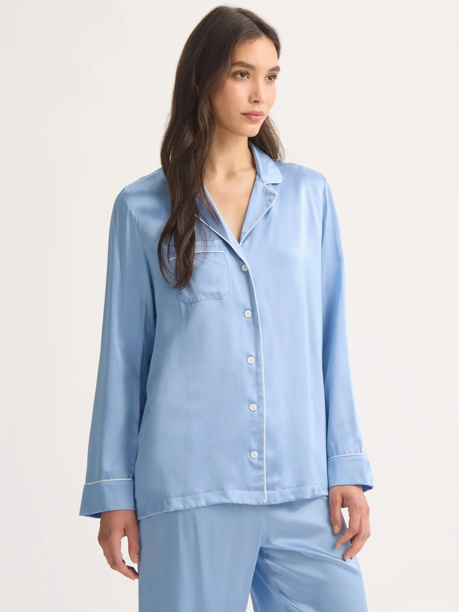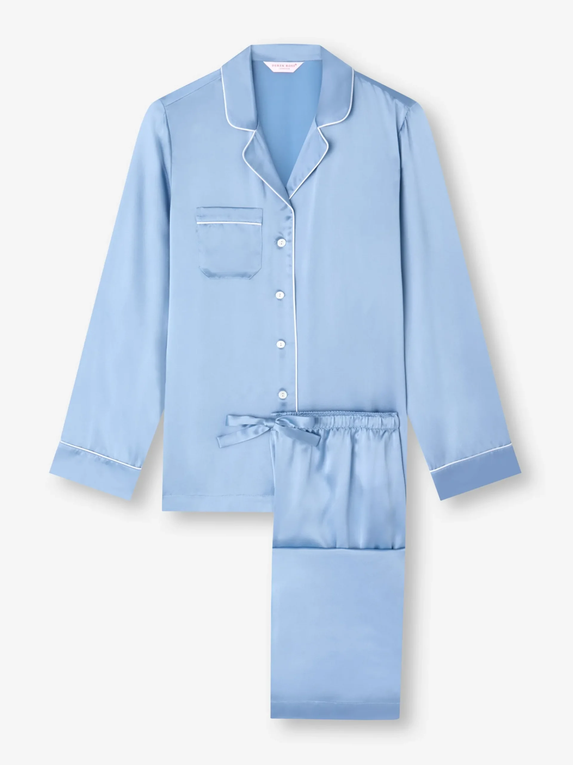 Crafted from 100% silk in a serene cloud blue, the women’s Bailey pyjamas are delicately cut by hand in our Cheshire workshop. Produced in limited quantities, each set reflects hours of expert craftsmanship to preserve the fabric’s supremely soft and smooth satin finish.