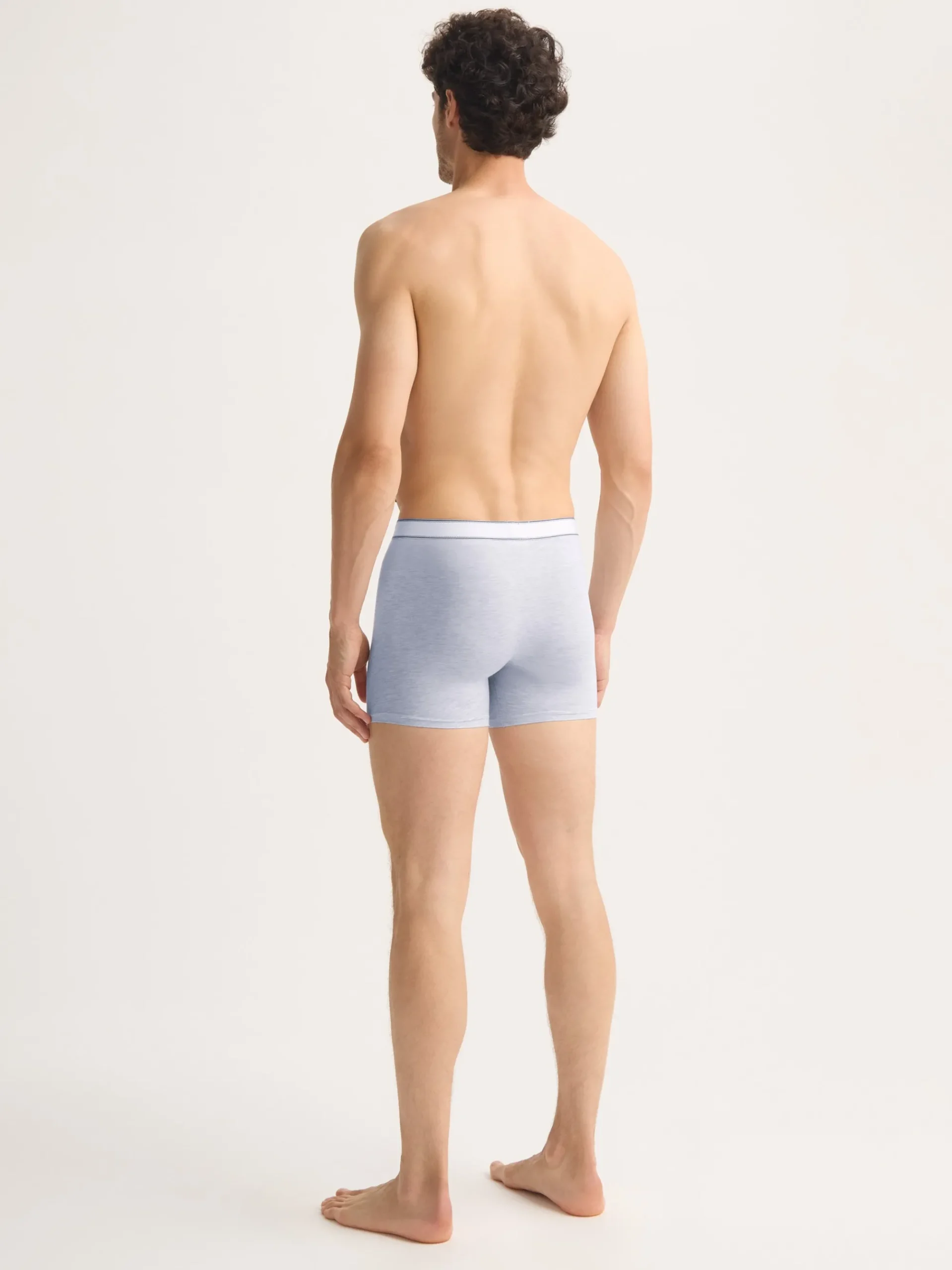 Our Ethan trunks in light blue marl offer a fitted shape, classic open fly front and longer leg for a minimalist, streamlined look.