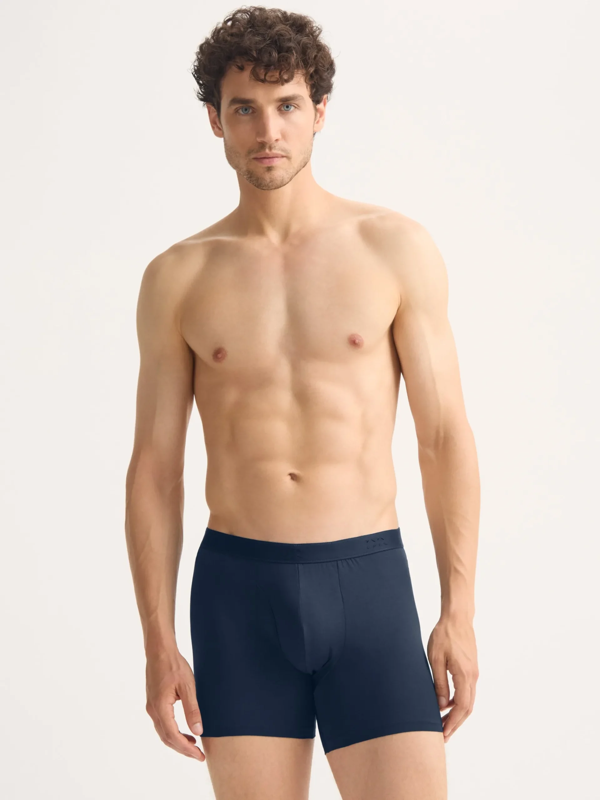 Our Jack trunks in navy blue are cut for a streamlined, classic look with a fitted shape, classic open fly front and a longer leg. A fabric-covered waistband provides gentle skin contact.
