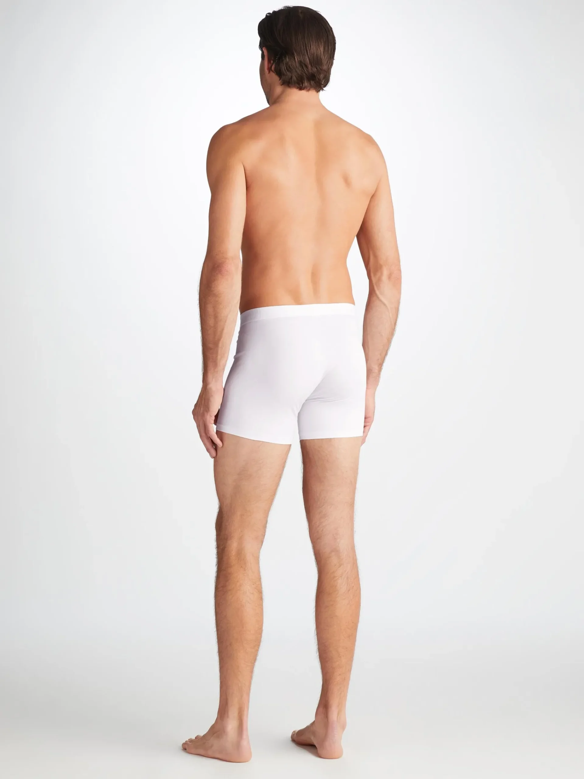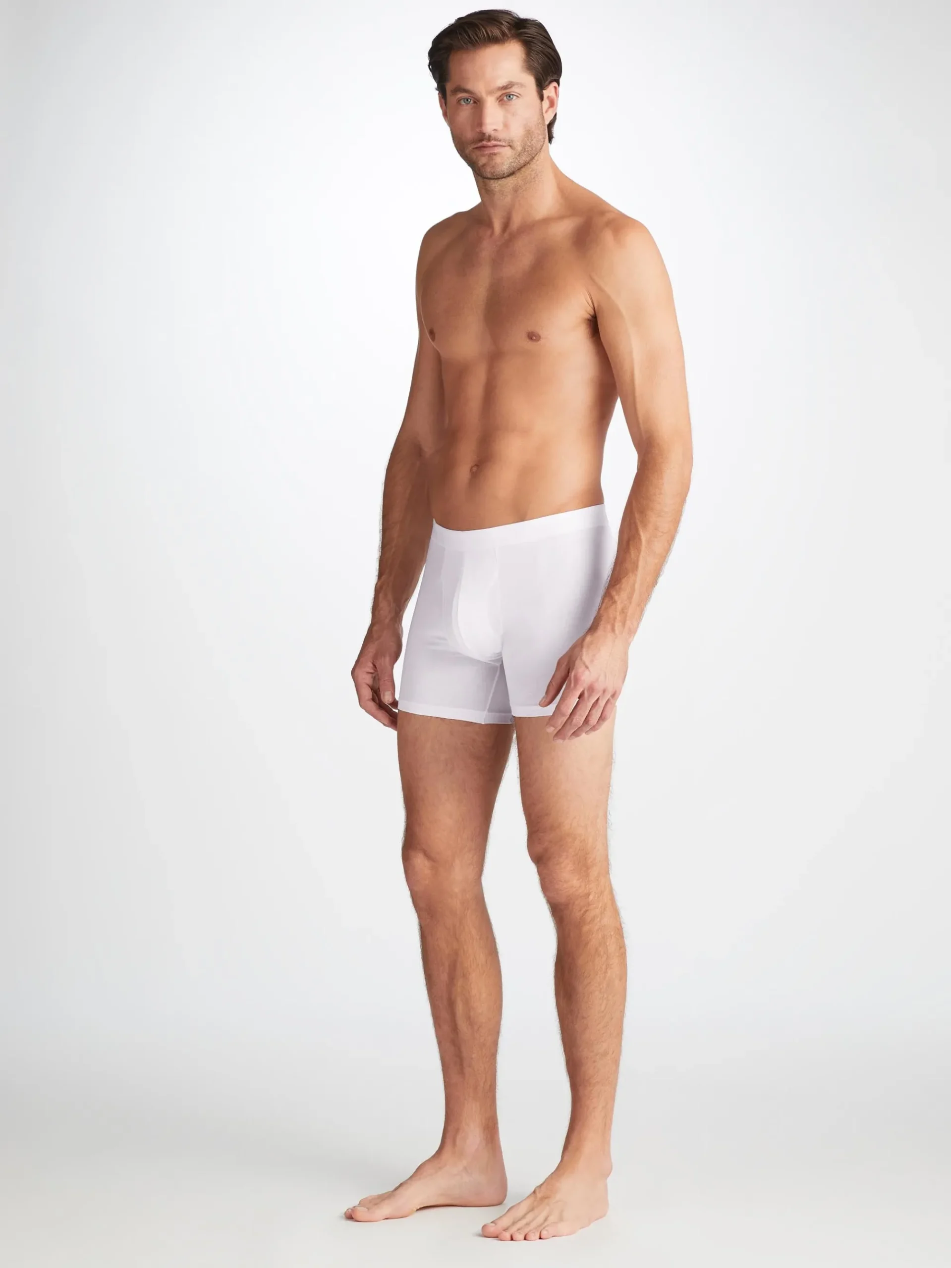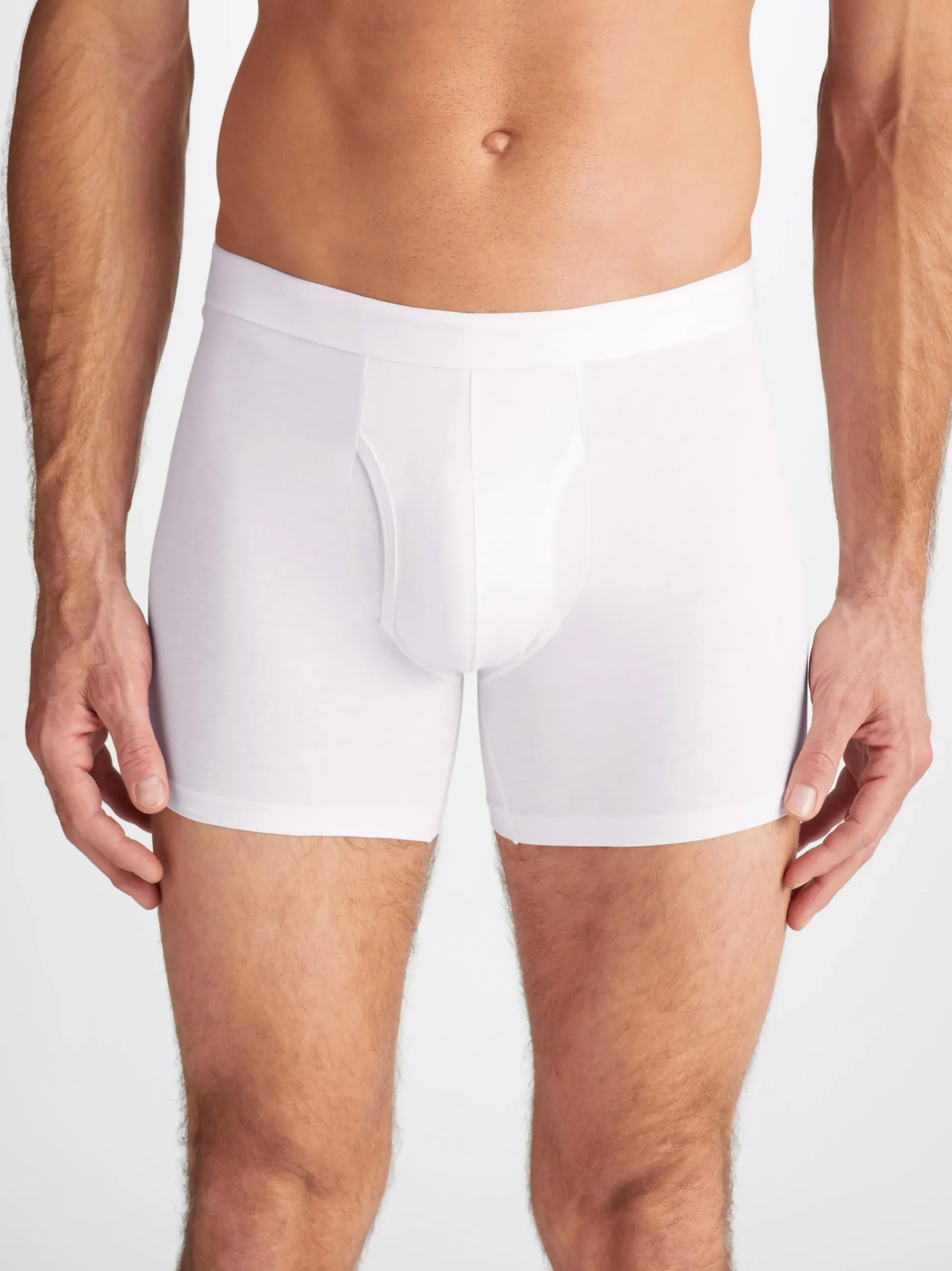 Our Jack trunks in white are cut for a streamlined, classic look with a fitted shape, classic fly open front and a longer leg. A fabric-covered waistband provides gentle skin contact.