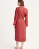 Cut to a flattering calf length, this style features a classic shawl collar, mitred waist tie, and practical pockets — two at the sides and one at the chest — for a polished yet comfortable finish.