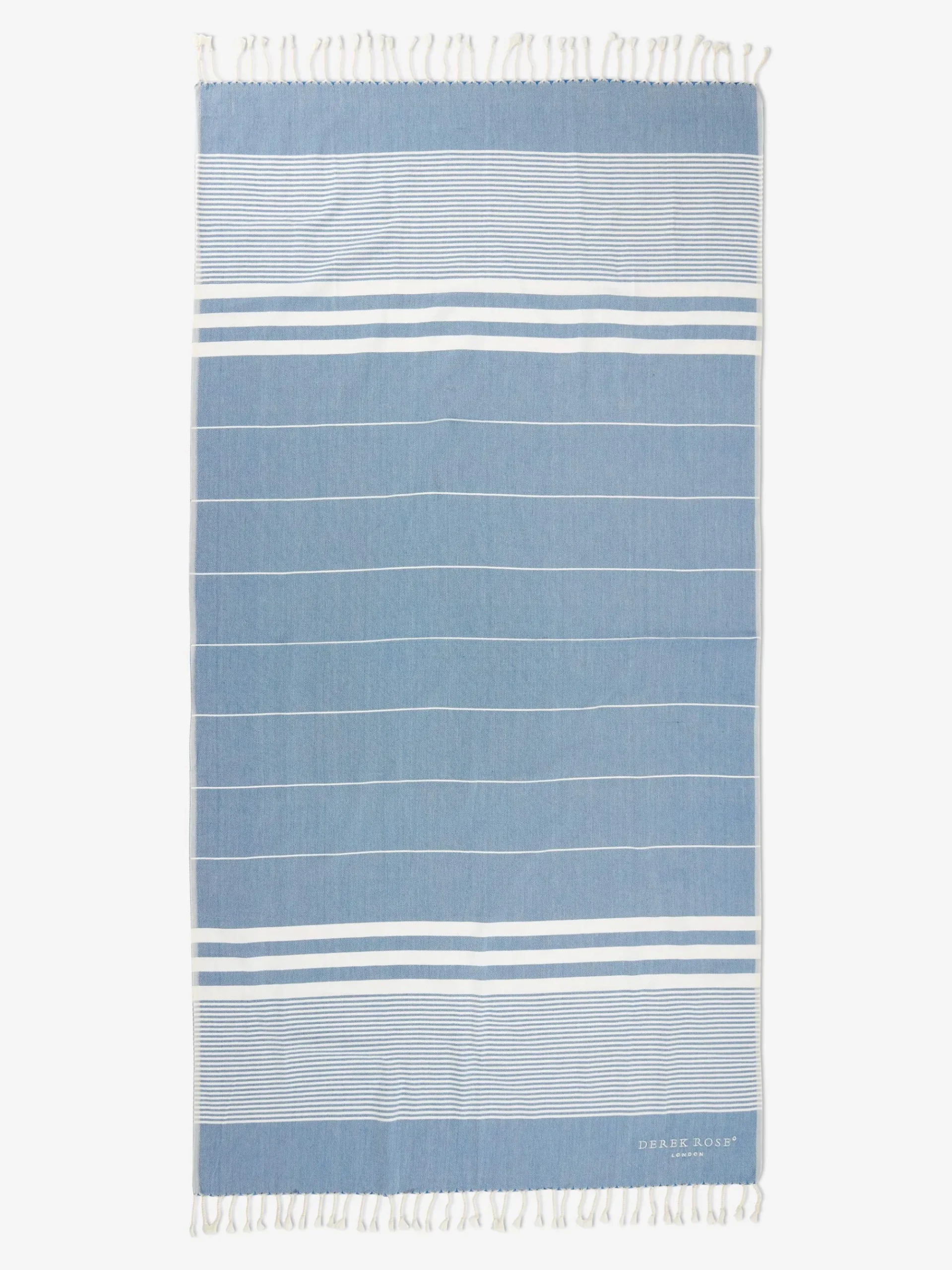 The perfect lifestyle and travel essential, our woven hammam towels are crafted from pure cotton for a fast-drying and stylish alternative to a beach towel. Featuring a striped pattern, with tasselled edges and the Derek Rose logo. Their lightweight and versatile nature means they can be neatly packed into your travel bag.