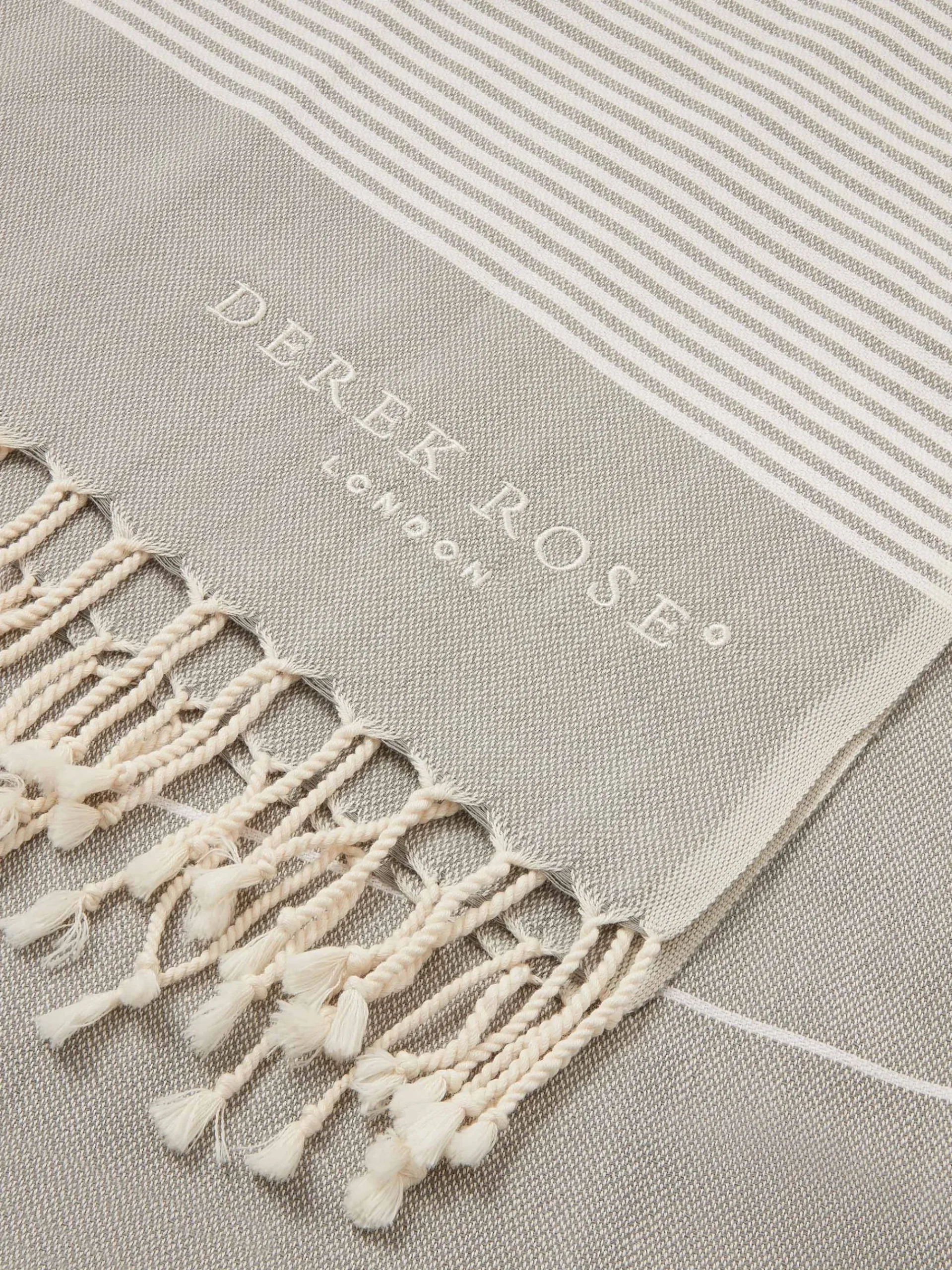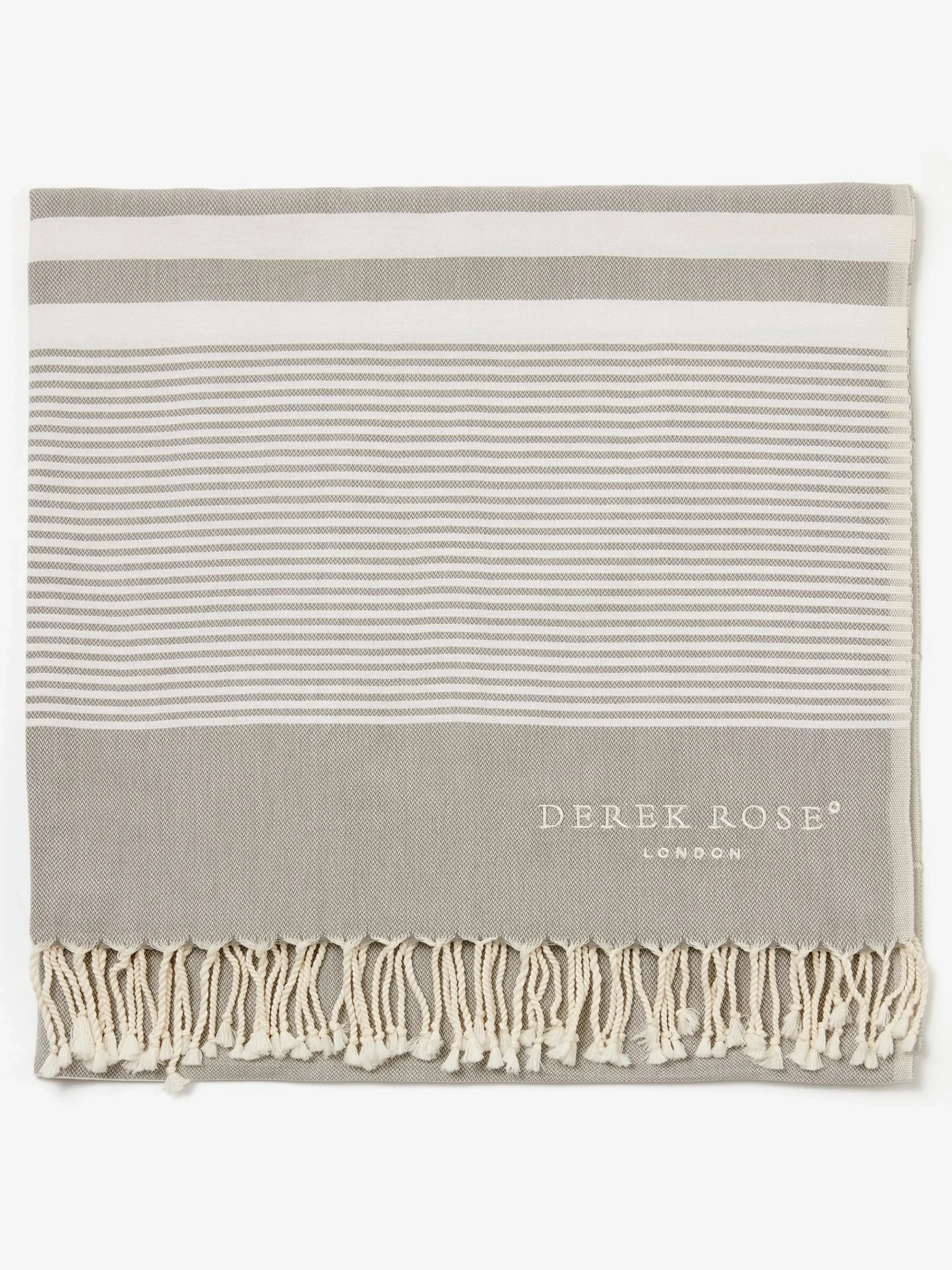 The perfect lifestyle and travel essential, our woven hammam towels are crafted from pure cotton for a fast-drying and stylish alternative to a beach towel. Featuring a striped pattern, with tasselled edges and the Derek Rose logo. Their lightweight and versatile nature means they can be neatly packed into your travel bag.r