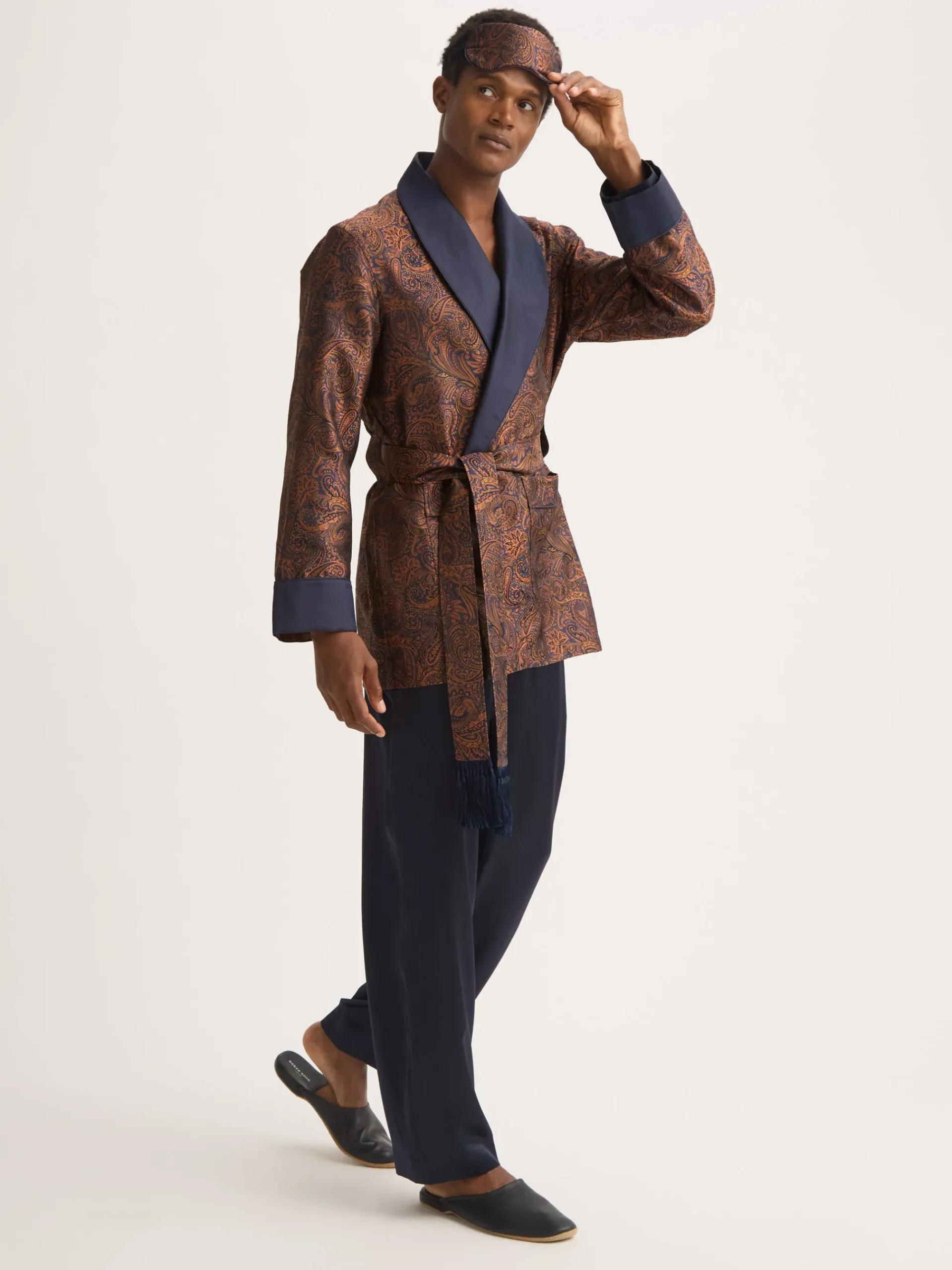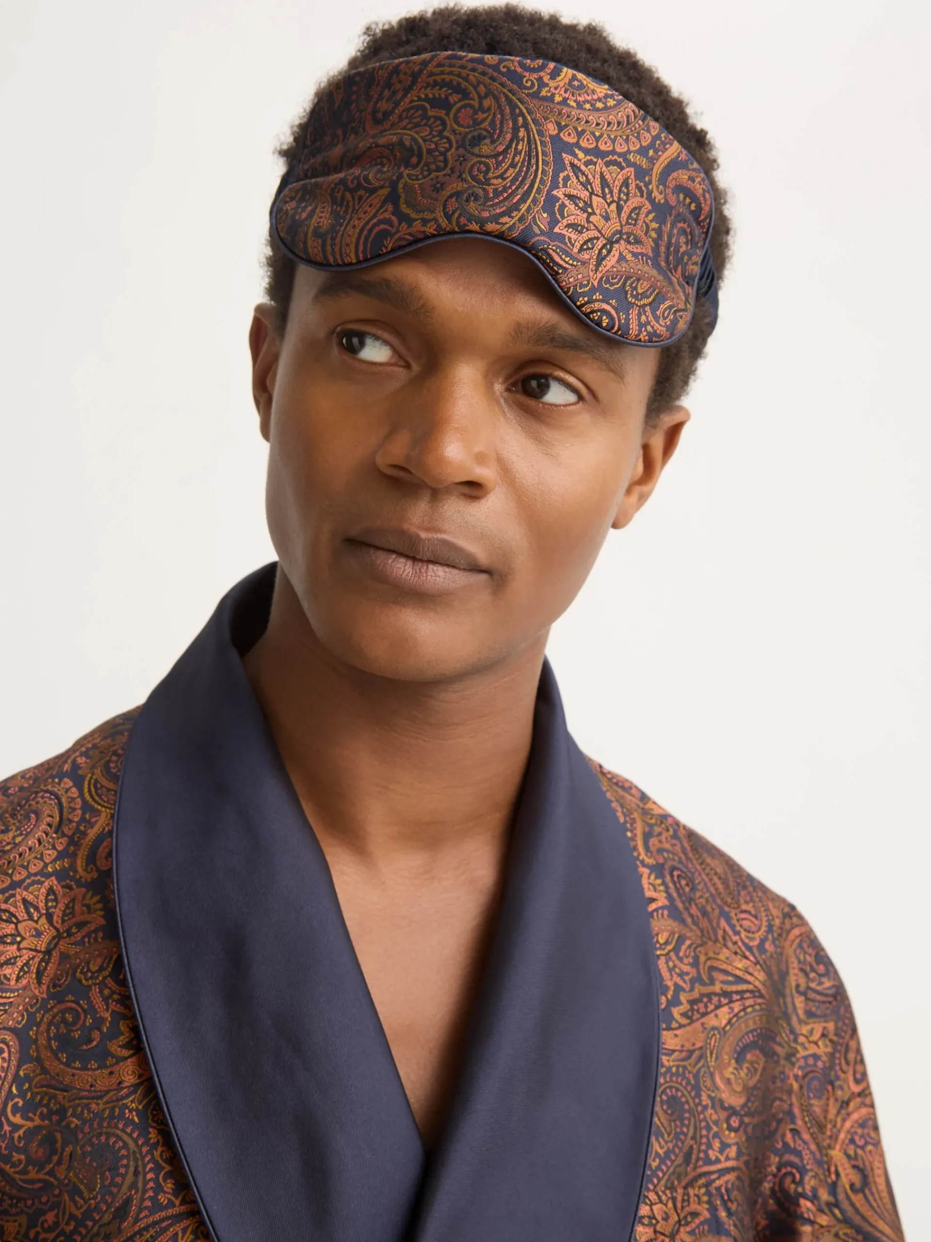 Adorned with a rich jacquard paisley weave in navy and antique gold, this silk eye mask is piped in complementary navy and finished with a silk-covered elastic strap for a secure yet gentle fit. Reversible for comfort, it ensures you stay cocooned in softness throughout the night.